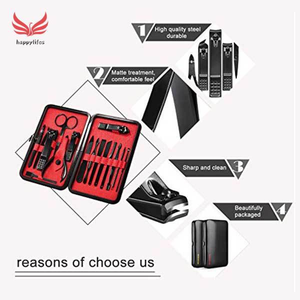 -------------Welcome to ✿happylifes✿ store----------- Decription: Feature: 16 Pieces Manicure Set: Contains 16 pieces nail and toenail tools for hands,foot and face care. this Manicure Pedicure set has every thing you need. 100% Stainless Steel High quality Tools: Our manicure and pedicure tools are made of professional surgical grade Stainless Steel to allow Safe Sterilization, Prevent Corrosion and Minimize Risk of Infections. Portable & Lightweight: This mens manicure set comes with a portable synthetic leather case that is easily opened with a push of a button. It is also very lightweight so you can carry it with you in your bag everyday or pack it with you when you go traveling. Best Gift: The Set comes in an intricately designed case that is both stylish and functional. This case is easy to open as well, all that you have to do is press the button and it opens up quickly. Perfect as a gift for men and women!Good for families and friends. Case Size: 15.5cmx10.5cm Included: 1 set x Manicure Pedicure Kit