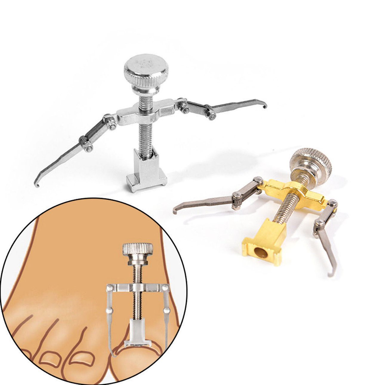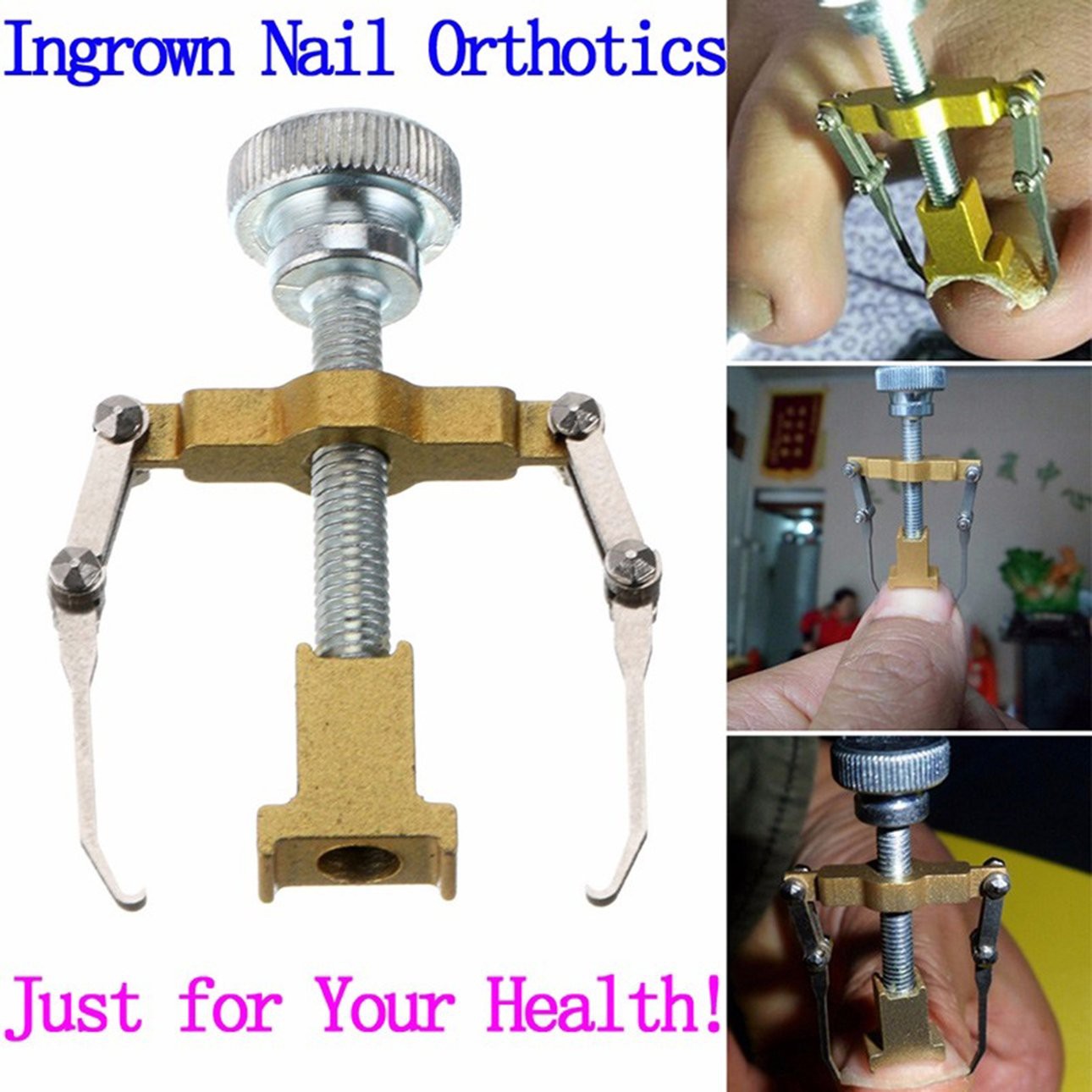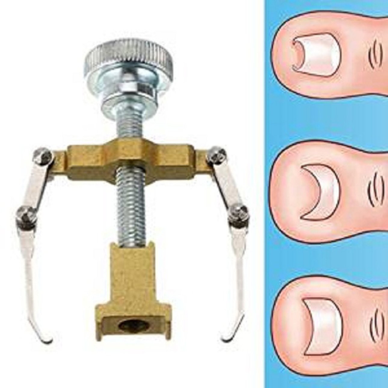 Ingrown Toe Nail Correction Tool Manicure Clipper Pedicure Fixer Recover Features: This product adopts lever mechanics to change the angle of nail growthIt is specially designed for curing ingrowing nails and paronychia and soon. Made by carbon steel, high hardness and intensity, no distortion. The angle of 2 hooks is specially suitable for the angle of toenails' growth, easier to reshape toenails. Simple but professional manicure tool, a great relief to ingrown toenails patients. Portable and mini size, available and convenient to carry it out when traveling or outdoors. Description: It is specially designed for curing ingrowing nails and paronychia and so on. Made of high-grade material, which makes it more durable, practical and healthy for you to use. Suitable for professional use as well as personal use. Specifications: Size: 40 * 25 mm Color: Gold, Silver Material: Carbon Steel Package included: 1 * Toe Nail Correction Tool How to use: 1.Use 35 degree hot water to Soak the foot about 20 mins 2.Hook both sides of the ingrown toenail with the two hooks on the equipment. 3.Use hand hold the middle fulcrum of the tool, twisting the nut to fix the equipment on the toenail with the other hand (fulcrum towards two directions for different sizes of the nails) 4.Slowly intensify, till there is a sense of expansion (no pain). (patients can soak your feet in warm water when take the correction ) 5.Intensify slightly for every 10 minutes. 6. After 30 minutes ,take the feet out of the water, wait for 15 minutes to dry feet. 7.Remove the equipment, the toenail is reshaped, position, stuff some medical cotton under the tilted nails to prevent rebound. Notes: 1.Due to the difference between different monitors,the picture may not reflect the actual color of the item. We guarantee the style is the same as shown in the pictures. 2.Due to the manual measurement and different measurement methods, please allow 1-3mm deviation. Thanks