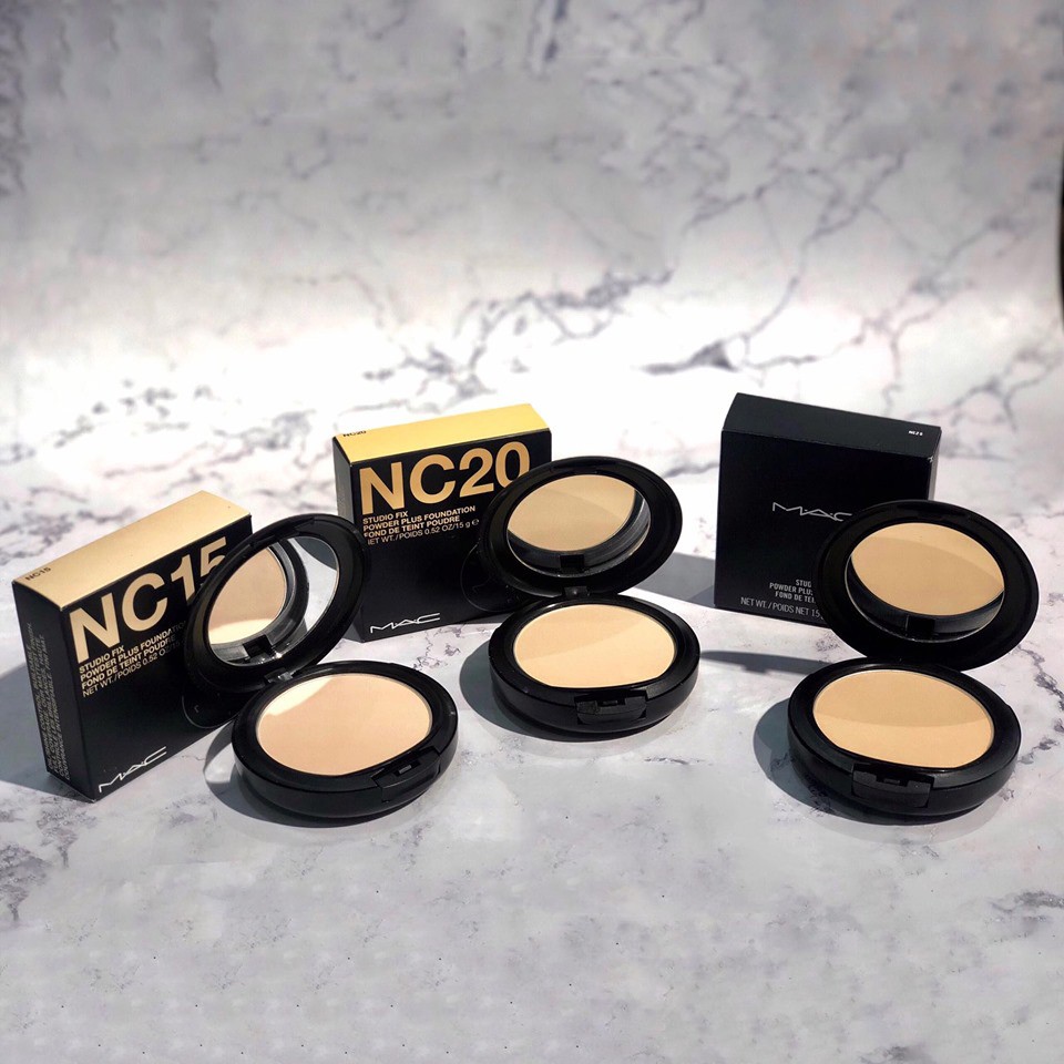PHẤN NỀN MAC STUDIO FIX POWDER PLUS Trọng lượng: 15g Thương hiệu: MAC Made in USA CÔNG DỤNG: - Phấn phủ Mac Studio Fix tích hợp 2 trong 1. Không chỉ là kem nền, nó còn đóng vai trò là phấn phủ, có khả năng che phủ rất cao. Chính vì vậy, đây là phấn được dùng nhiều trong trang điểm chuyên nghiệp và trang điểm hàng ngày. - Phấn nền Mac Studio Fix Powder giúp định hình lớp make up và hút dầu, cho da tự nhiên. - Phấn nền Mac có đặc tính che phủ tốt. Bên cạnh đó, phấn còn tạo ra độ mịn cao, kiềm dầu cực tốt. - Độ bám màu lâu, màu sắc ăn ảnh cũng khiến nhiều phụ nữ chọn lựa MAC. - Mac Studio Fix Powder Plus Foundation NC15 không kén da, tạo ra độ mịn cao, bắt ánh sáng tốt, làm đều màu da. - Hơn nữa, nó còn giúp che khuyết điểm hoàn hảo. Bảo vệ da trước những thay đổi của môi trường bên ngoài. - Độ bám và độ che phủ cũng được MAC hoàn hảo hoá cho dòng sản phẩm này. Phấn không chỉ làm đồng nhất màu da của bạn mà còn thực hiện tốt nghĩa vụ che lấp những khuyết điểm "xấu xí" và đánh bại các tác nhân gây ảnh hưởng đến lớp nền để lớp nền bền đẹp suốt 8 giờ. - Thành phần có chứa silica với nhiệm vụ kiểm soát dầu và thu nhỏ lỗ chân lông nhưng không gây khô da. Các Tone màu có sẵn: NC 15: cho da sáng. NC 20: cho da tự sáng – tự nhiên, base hồng.