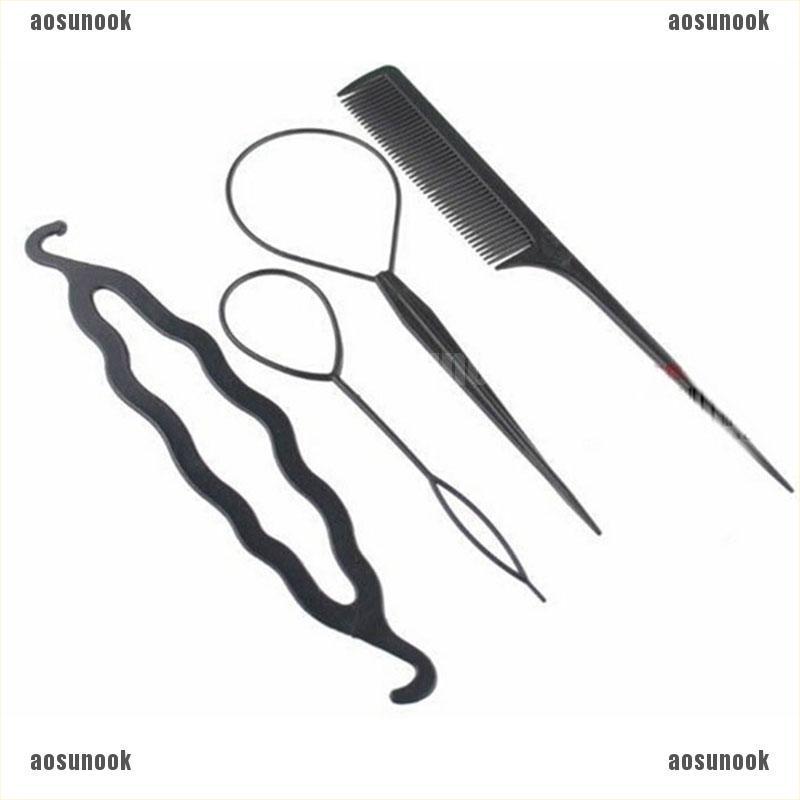 【aosunook】4pc Set Hair Styling Clip Bun Maker+Topsy Tail Braid Ponytail MakerMaterial: PLASTIC Colour: Black Qty: 4pcs /Set