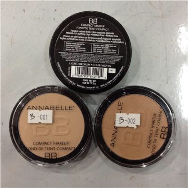 Phấn nền Annabelle BB Compact Make-up _ Hàng Chính hãng _ Xuất xứ: Canada Đẹp không tì vết hàng ngày với sản phẩm trang điểm sáng đẹp nhỏ gọn. Hấp thụ bã nhờn, kiểm soát bóng dầu và phù hợp hoàn hảo cho da. Màu 001 : màu da sáng Màu 002: màu da tự nhiên #phannen