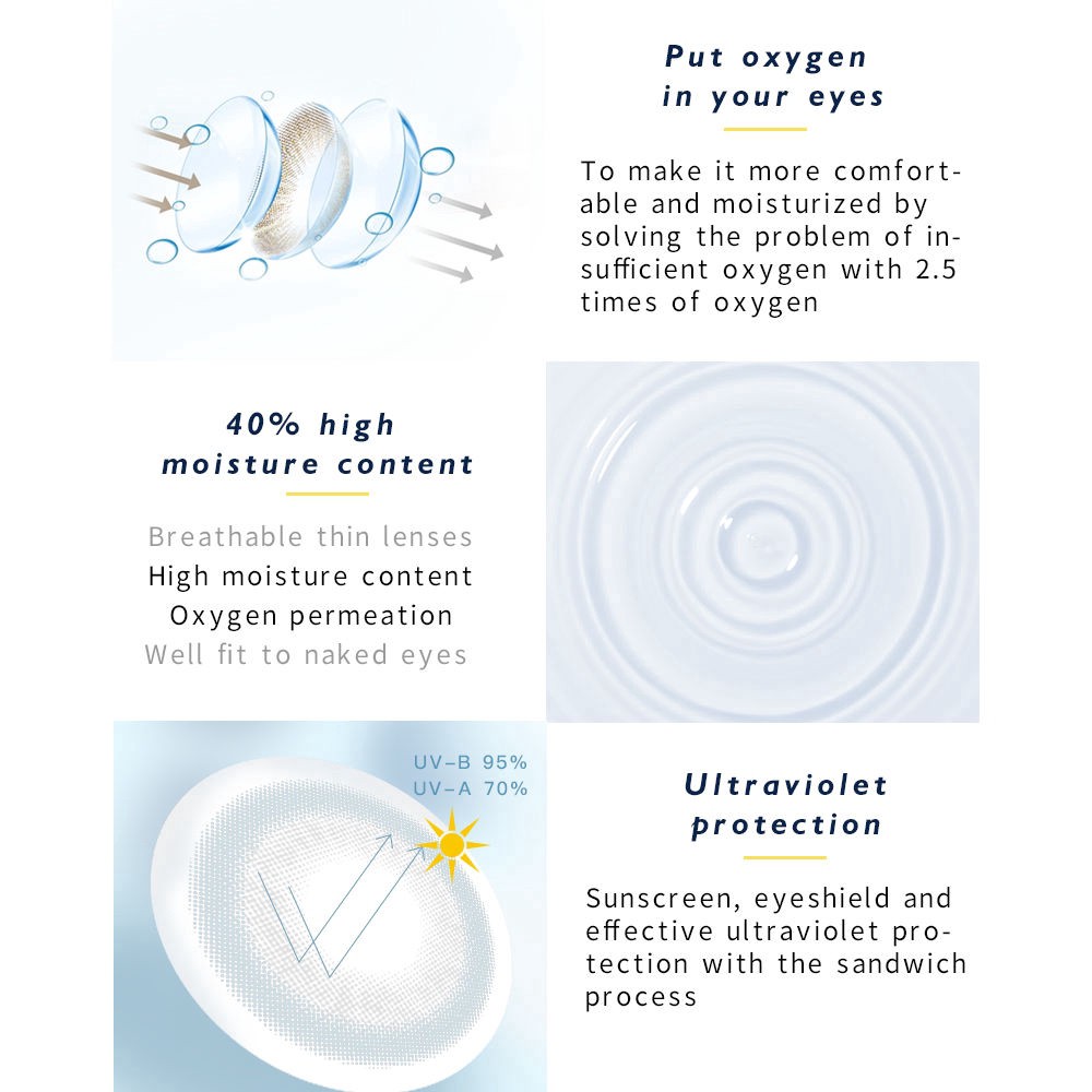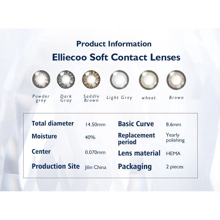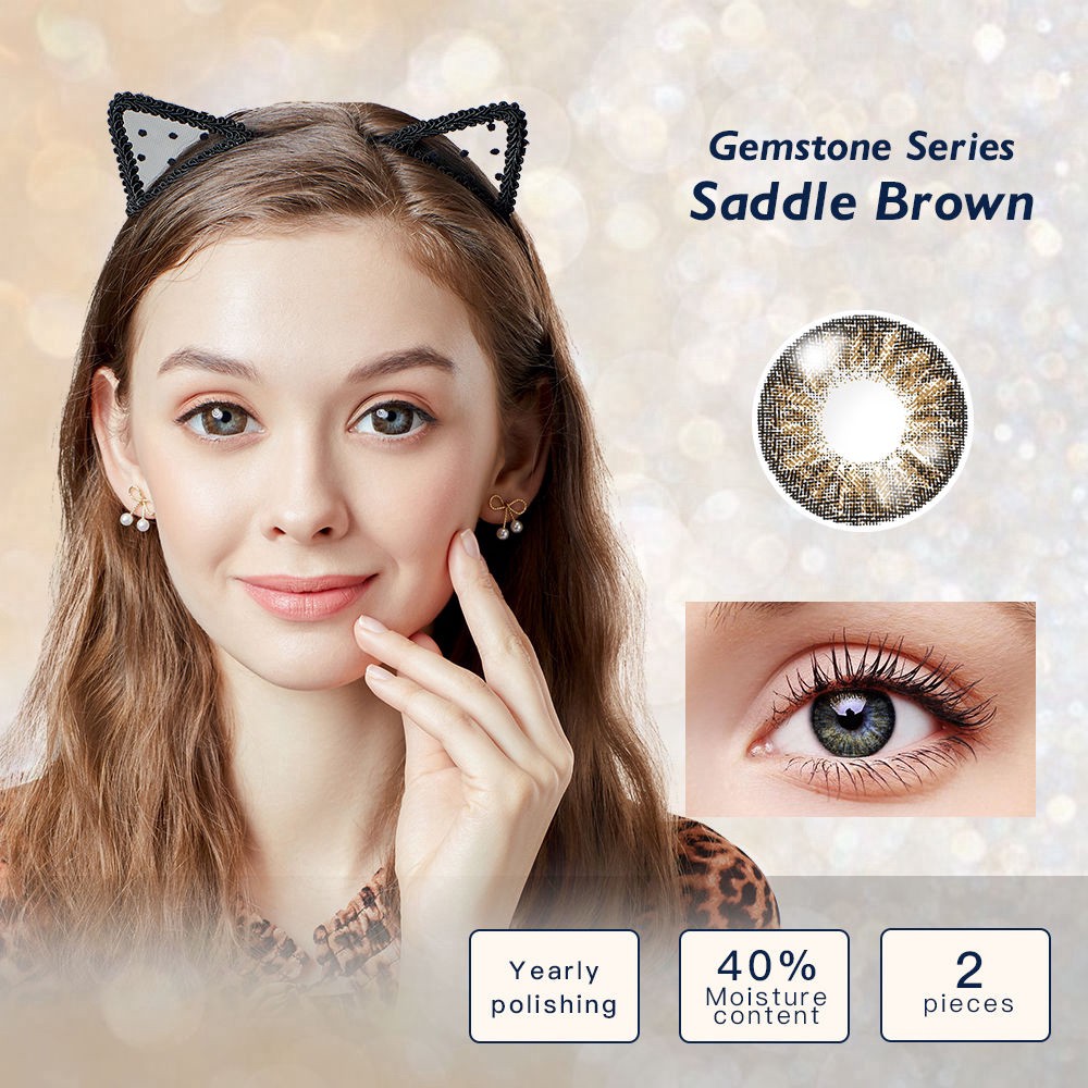 Elliecoo colored eye lenses contact lenses saddle brown gemstone series natural looking beautiful pupil dazzling cosmetics yearly 2 pcs/pair Product Information Elliecoo soft contact lenses The gemstone series Total diameter :14.50mm Basic curve: 8.6mm Moisture:40% Replacement period: yearly polishing Center:0.070mm Lens Material: Hema Packaging:2 pieces Fearture: 1.with the hyaluronic acid,moisturizing ingredient 2. put oxygen in your eyes To make it more comfortable and moisturized by solving the problem of insufficient oxygen with 2.5 times of oxygen 3.40% high moisture content Breathable thin lenses, high moisture content, oxygen permeation Well fit to naked eyes 4.Ultraviolet-proof, hold up a sunshade for your eyes, effectively prevent ultraviolet, the whole-day breathability and moisture Outing & Travel High moisturizing lenses to maintain continuous moisture for outing and travel Take a nap at noon Eye-closed nap can effectively maintain sufficient oxygen for both eyes and reject the red blood streak. Overnight office Our product can make you work assured at night with long-term moisture and growing efficiency. Wearing steps 1. clean your hands and place the lens on your fingertip. 2. life your upper eyelid and pull the lower one to wear it smoothly. 3. slowly open your eyelids, then close your eyes, and repeat for several times to adapt. Grasping the brand core values of staying professional, healthy and fashionable, elliecoo has been focusing on the solution to myopic colored contact lenses. The marvellous oxygen permeability of elliecoo colored contact lenses delivers extremely soft and comfortable contact feel, and makes it healthier to wear. Committed to producing colored contact lenses especially for Myopic eyes, elliecoo adopts the advanced technology combining original import of materials of etafilcon A from Singapore and the leading sand technique that wraps pigment layer inside the lenses preventing possible direct eye contacts. All pigments formulated have been strictly tested and got the approval of US FDA (U.S. Food and Drug Administration), while they have passed the careful tests of national authoritative inspection agencies and been proven to meet definitely safety standards. The lenses are even ultraviolet rays proof, just feel free to wear elliecoo products. Elliecoo, focusing on myopic colored contact lenses, brings you a wonderful world as seen by colored eyes telling fashion and returning with a wide range of vision that never misses beauties around the world. # Elliecoo # colorful eye # lenses # contactlens # softlens # Brown # natural pupil # yearly # Soft lens # eye