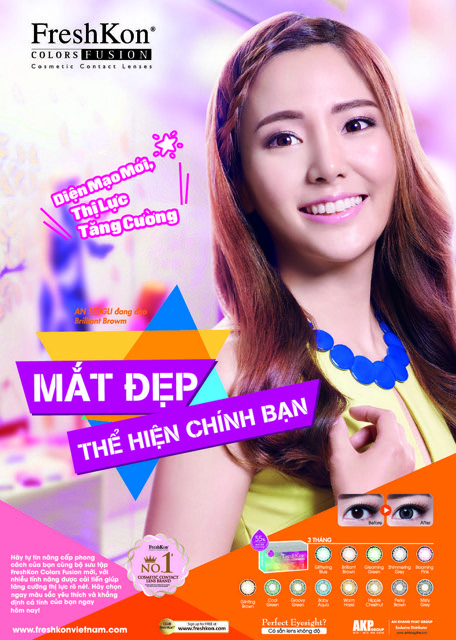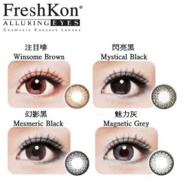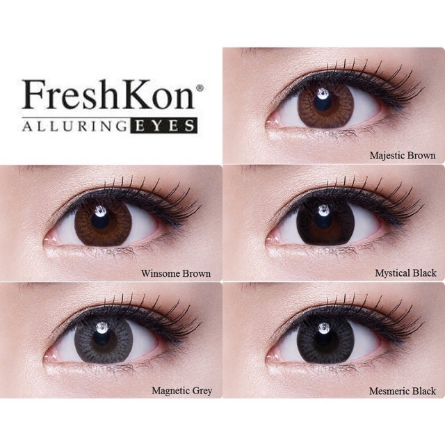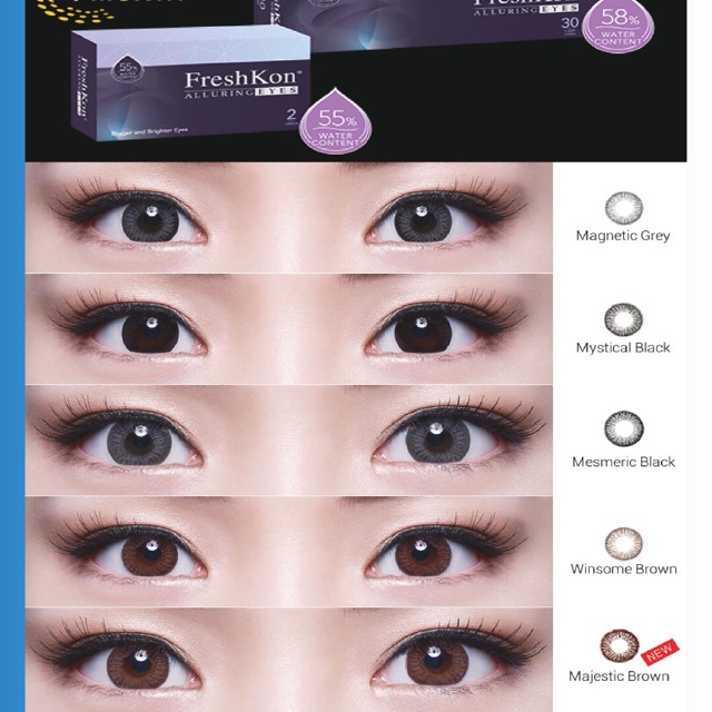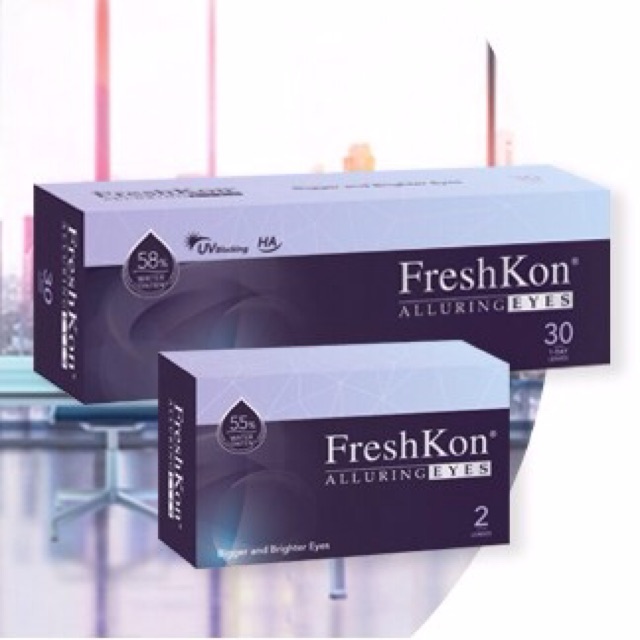 Từ hôm nay, hãy để những tính năng cải tiến MỚI nhất của FreshKon® Alluring Eyes giúp bạn có một thị lực rõ nét và đôi mắt tự nhiên quyến rũ từng phút mỗi ngày nhé! - tặng 1 khay ngâm lens và một quấn sách hưỡng dẫn đeo lens Cải tiến tông màu tối hơn cho hiệu ứng mắt tự nhiên hơn Độ ngâm nước 55% Đường kính 14.2mm Bán kính cong 8.6 mm Dãy độ cận 0.00D ( Plano 0.50D đến -6.00D ( bước nhảy 0.25) 6.5D đến -9.00D ( bước nhảy 0.50 ) Ánh nhìn tự nhiên 5 tông màu tuyệt vời để thay đổi mỗi ngày. Đường kính vùng in được nâng lên 13.5mm cho mắt to hơn và sáng hơn. Cực kì dễ chịu Bề mặt Hydrophilic thích nước cho sự thoải mái dài lâu Hàm lượng nước trong kính lên đến 55% cho sự thoải mái tối đa Dễ dàng sử dụng và thao tác. Thị lực tuyệt hảo Vùng quang học rộng hơn cho tầm nhìn rõ nét và không giới hạn Dãy độ cận từ - 0.00D đến -10.00 độ Công nghệ vi cách Hydro Các vi màu được khóa, cách nhiệt và cách li với mắt. Lợi ích: Mang lại sự thoải mái tối đa khi dùng kính.