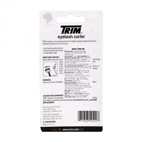Kẹp Trim được làm từ sắt mạ kẽm bền đẹp chắc chắn. Chỉ với một vài lần bấm đã có thể hô biến đôi hàng mi trở nên cong vút, gợi cảm, giúp bạn tự tin bước xuống phố cuốn hút mọi ánh nhìn. Sản phẩm sử dụng trước khi dùng mascara. Thành phần: Sắt mạ kẽm Hướng dẫn sử dụng: Mở rộng bấm mi, đặt lông mi giữa 2 miếng đệm, ép chúng lại nhẹ nhàng, dứt khoát trong khoảng 15 đến 20 giây. Sử dụng trước khi dùng mascara. Bảo quản: Nơi khô ráo thoáng mát Quy cách đóng gói: 1 cái/vỉ Xuất xứ thương hiệu: Mỹ