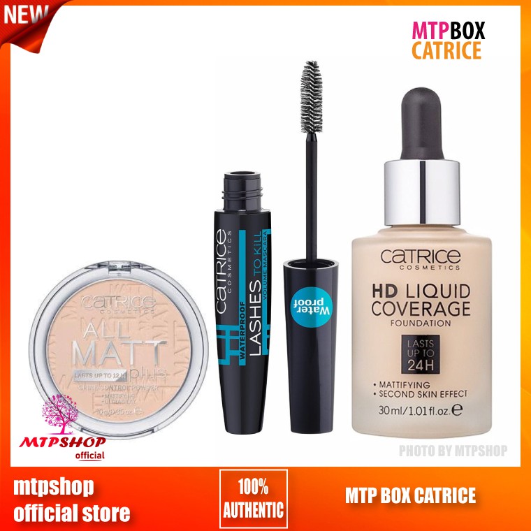 COMBO GỒM CÓ 3 SẢN PHẨM 01-Kem nền Catrice HD Liquid Coverage Foundation Kem nền Catrice HD Liquid Coverage được thiết kế với thể tích 30 ml trong chai đựng với chất lượng cao cấp. Điểm nhấn trong thiết kế của Catrice HD Liquid Coverage Foudation là ống nhỏ giọt với tay cầm bắng cao su giúp cho việc lấy kem và điều chỉnh lượng kem phù hợp dễ dàng hơn. Ngoài ra, thiết kế đơn giản, chắc chắn giúp lớp kem bên trong Catrice HD Liquid Coverage Foudation cũng được bảo quản tốt hơn. Một lớp kem nền chất lượng không chỉ mang lại độ che phủ tốt, mùi hương nhẹ nhàng mà giá cả cũng cần phải hợp lý. Có thể nói Catrice HD Liquid Coverage Foudation đã đáp ứng được đầy đủ các yêu cầu trên. Lớp kem của Catrice HD Liquid Coverage Foudation vô cùng mỏng, mịn và đem lại hiệu quả che phủ hiệu quả. Không chỉ vậy, các nghiên cứu đã chỉ ra rằng Catrice HD Liquid Coverage Foudation không chỉ là lớp kem nền hoàn hảo mà còn chứa nhiều dưỡng chất cần thiết, giúp dưỡng da hiệu quả. Vì vậy, nếu sử dụng Catrice HD Liquid Coverage Foudation trên 8 tuần trở lên, bạn sẽ có thể thấy sự sáng lên rõ ràng của các đốm đậm màu. 02-Phấn Phủ Catrice All Matt Plus Shine Control Powder Phấn Phủ Catrice All Matt Plus Shine Control Powder dạng nén với khả năng hấp thụ lớp dầu dư thừa để gương mặt bạn không bóng nhờn lên đến 12 giờ, thích hợp cho da dầu và da hỗn hợp. Catrice là hãng mỹ phẩm nổi tiếng nhất tại Đức được các chị em cũng như các chuyên gia trang điểm tin dùng và lựa chọn. Các sản phẩm của Catrice luôn được tuân thủ kiểm tra gắt gao về chất lượng và rất đa dạng, phù hợp mọi lứa tuổi, mọi loại da. Catrice là hãng mỹ phẩm Drugstore nhưng vẫn xứng tầm các sản phẩm highend. Phấn phủ Catrice All Matt Plus Shine Control Powder là con cưng của mỹ phẩm Catrice, sản phẩm bán chạy nhất dành cho da dầu và hỗn hợp vì độ kiềm dầu rất tốt. Phấn phủ là một trong những bước không thể thiếu khi makeup, nhưng nỗi lo canh cánh là make-up thường xuyên có làm cho làn da của chúng ta bị tổn hại về lâu về dài. Với công nghệ vượt bậc, tiên tiến nhất của Đức, hãng mỹ phẩm Catrice đã cho ra đời phấn phủ Catrice All Matt Plus Shine Control Powder với các thành phần cực kì an toàn cho da, đã được kiểm nghiệm gắt gao nhất. 03-Mascara Dày Mi Catrice Lashes To Kill Waterproof Volume Mascara Dày Mi Catrice Lashes To Kill Waterproof Volume 1✨ Mascara Catrice với công thức đặc biệt, mang đến cho bạn một làn mi dày dặn, cong vút tự nhiên, quyến rũ kéo dài trong nhiều giờ liền.