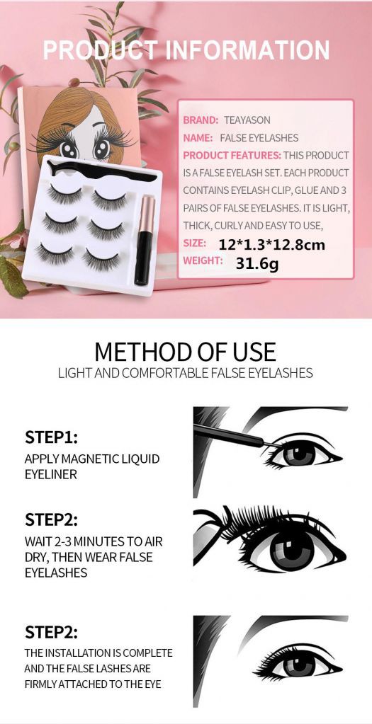 Description: The eyeliner has a fine and smooth texture and is naturally beautiful. It can be used in one liquid and dual-purpose, which can effectively absorb the magnet eyelashes, and can also be used alone as an eyeliner for makeup. No eyelash glue required, easy to use. It remains intact throughout the day, and it is easy to remove and reposition it. Makeup quickly, easier to wear and adjust the angle. Adopt 5 magnetic process, the adsorption is firmer. Waterproof and sweatproof, long-lasting makeup without smudging. how to use: 1. Apply magnetic eyeliner. 2. Wait 3-4 minutes for the eyeliner to air dry. 3. Wear eyelashes in the right position. 4. Slightly adjusted and successfully worn. Specifications: Applicable people: General Skin Type: General Applicable occasions: universal Net content: 3.5g Product features: beauty makeup black technology, quantum magnetic false eyelashes, magnetic absorption, no glue and no harm, firm and no makeup, natural and realistic, free to release the electric eye light. Package Included: 3 pairs * magnetic false eyelashes 1 * eyelash tweezers 1 * Magnetic Eyeliner Notes: Due to the difference between different monitors, the pictures may not reflect the actual color of the item. Compare the detail sizes with yours, please allow 1-3cm error, due to manual measurement. Please leaving a message before you give the bad feedback, if the products have some problems. Thanks for your understandings.