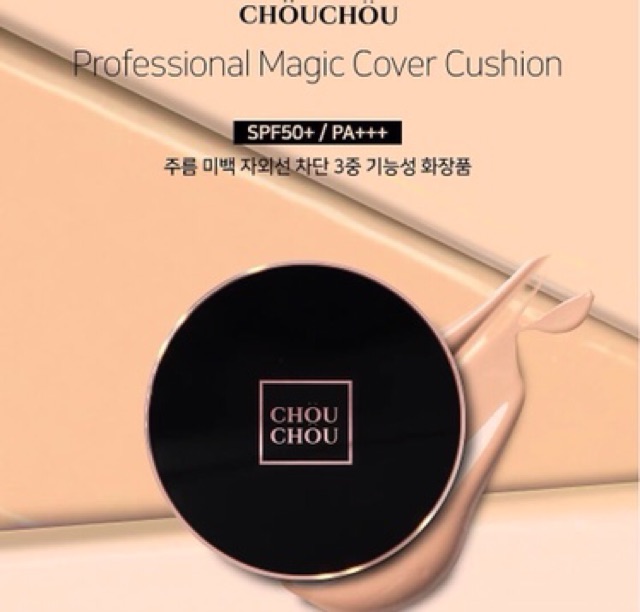 🛑🛑Phấn nước ChouChou Professional Magic Cover Cushion là sản phẩm phấn nước chiết xuất từ 7 loại hoa trong công nghệ “7 Flower Complex” giúp mang lại lớp nền hoàn hảo và nuôi dưỡng làn da căng mịn, khỏe mạnh. 🛑Thiết kế: Phấn nước ChouChou Professional Magic Cover Cushion được thiết kế vô cùng sang trọng với vỏ màu đen quyến rũ được tô điểm bằng viền vàng lấp lánh. Bông tán phấn được thiết kế đặc biệt với một đầu nhọn giúp bạn dễ dàng tán phấn ở những vùng da khuất, khó tán đều như cạnh mũi, bọng mắt, khóe mắt, vùng gần mang tai, chân tóc, vùng xung quanh miệng,… Mặt bông phấn mềm mịn và hoàn toàn không nuốt phấn, giúp bạn lấy được lượng phấn vừa phải, không bị lãng phí. 🛑Công dụng: Phấn nước ChouChou Professional Magic Cover Cushion có độ che phủ cực tốt, giúp dễ dàng che phủ các khuyết điểm trên da, giúp mang lại lớp trang điểm rạng rỡ, mịn màng không tì vết. Kết cấu phấn mỏng mịn, tự nhiên, phấn tiệp vào da ngay lập tức khi vừa thoa, không hề gây cảm giác bết dính, khó chịu cho da. Khả năng giữ màu tốt, lớp phấn có thể bền màu trong 4-5 tiếng đồng hồ mà không lo da bị xuống tone. Phấn nước được chiết xuất 7 loại hoa như hoa mẫu đơn, hoa lily, hoa oải hương,.. trong công nghệ “7 Flower Complex” giúp da bạn luôn ẩm mướt, không bị hiện tượng khô hay mốc da khi thoa phấn. Sản phẩm có chỉ số chống nắng SPF 50+ PA+++ giúp bảo vệ da khỏi các tác hại của ánh nắng mặt trời, ngăn ngừa tình trạng da bị lão hóa sớm và đen sạm.