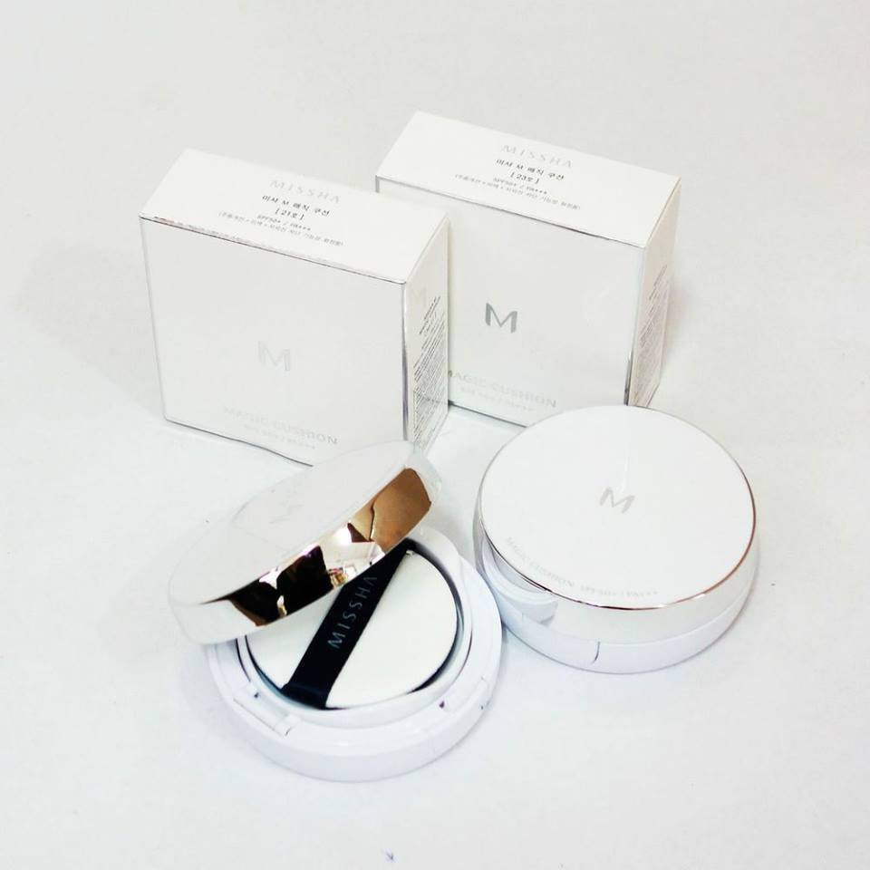 Phấn nước Missha M Magic Cushion SPF 50+ PA+++1 LÕI Missha M Magic Cushion được đặt trong 1 vỏ hộp tròn, chất liệu nhựa viền kim loại. Thiết kế không quá sang trọng nhưng lại có vẻ đơn giản, dễ thương: - Phấn nước nền với khả năng che phủ hoàn hảo giúp che phủ tốt các khuyết điểm trên da. - Duy trì lớp trang điểm trong thời gian dài mà không xảy ra hiện tượng xuống tông khiến khuôn mặt bị tối. - Phấn tạo cảm giác da mướt, mượt mà không bị môc hay khô da. - Độ kiềm dầu tốt, phù hợp với cả bạn da dầu hay hỗn hợp dầu đến da thường. - Kết cấu kem mềm mỏng mịn giúp tăng khả năng bám trên da và không bị bết dính. - Thành phần chính: nước cây tre, chiết xuất cây baobap, nước cây phỉ nguyên chất giúp làm dịu da và cung cấp dưỡng chất cho da. - bổ sung nước khoáng và cây phỉ giúp se da, khít lỗ chân lông, tăng cường dưỡng ẩm. tạo nên một bề mặt make up mịn màng, bóng khoẻ và tự nhiên nhất. - Độ chống nắng cao, thích hợp dùng mùa hè. Tiết kiệm, dễ sử dụng. Dùng cho mọi loại da! Sản phẩm có 2 tone màu: #21- light beige (màu sáng), #23- natural beige (màu tự nhiên)