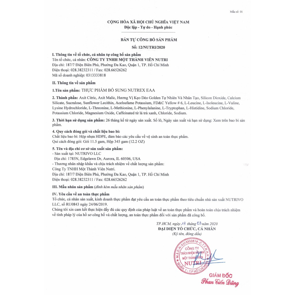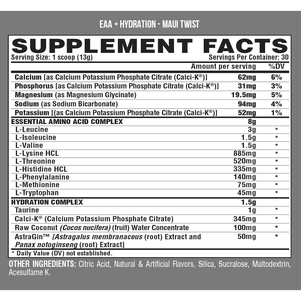 + Nutrex EAA+Hydration EAA+ HYDRATION là một sản phẩm nổi bật thực sự trong cả 2 chuỗi Axit Amin thiết yếu (EAA) và Axit Amin chuỗi nhánh (BCAA). Giúp cung cấp cơ thể một lượng EAA đầy đủ hiệu quả bao gồm cả BCAA cần thiết để tăng sự tổng hợp protein ở trong cơ bắp. Mỗi một lần dùng cung cấp 8g EAA . Điều quan trọng nhất là cơ thể chúng ta thường xuyên tiêu thụ các Axit Amin với một số lượng lớn thông qua chế độ ăn uống hoặc bổ sung chúng một cách hợp lý . Tại sao lại vậy? Vì cơ thể chúng ta không thể tự sản suất chúng và chắc chắn sẽ khó phát triển khi thiếu đi các chuỗi Axit Amin (EAA) trong cơ thể. + Thành phần và công dụng Nutrex EAA+Hydration ✅ 8G EAA giúp phát triển cơ bắp và phục hồi cơ bắp tốt hơn. ✅ Rất phù hợp với Whey Isolate và Whey Casein giúp tối ưu hóa việc xây dựng cơ bắp. ✅ Bao gồm 6G BCAA tỉ lệ tối ưu cho BCAA là 2:1:1. ✅ Cải thiện và nâng cao sức mạnh của cơ bắp và tăng hiệu suất tập luyện. ✅ 1.5 G HYDRATION giúp cung cấp thêm các chất điện giải quan trọng để tối ưu hóa việc hấp thụ và đồng hóa các chất điện giải chính trong cơ thể. HDSD: Cách Dùng: Pha 1 muỗng + 300-500ml có thể dùng trong hoặc sau tập Xuất Xứ: USA Hạn sử dụng luôn luôn xa, liên hệ với shop để biết Date ( Vì hàng về liên tục, date thay đổi theo thời gian ) SẢN PHẨM KHÔNG PHẢI LÀ THUỐC VÀ KHÔNG THAY THẾ THUỐC CHỮA BỆNH.