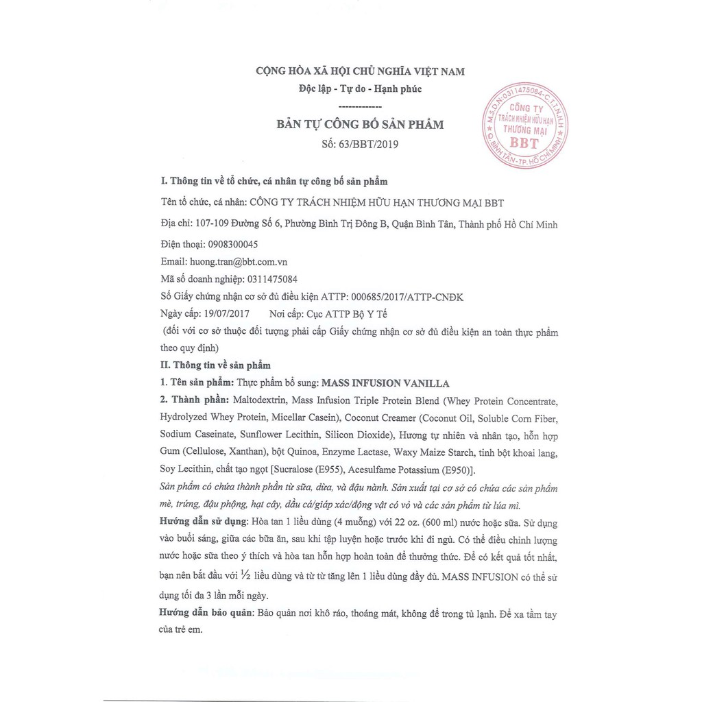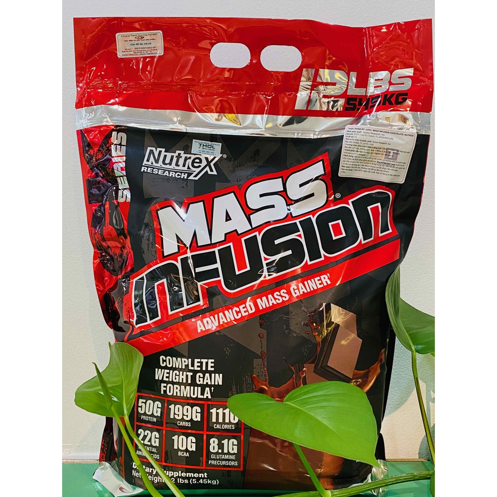 MASS INFUSION là một công thức tăng cân cải tiến, cung cấp cho cơ thể 50g protein chất lượng cao, 1120 calo và 200g carb trong mỗi liều dùng. Công thức dinh dưỡng này vô cùng lý tưởng dành cho những ai có nhu cầu tăng cân nhanh, trở nên to khỏe và mạnh mẽ hơn. MASS INFUSION chứa 3 nguồn protein khác nhau: Whey Protein Concentrate, Hydrolyzed Whey Protein, Micellar Casein hỗ trợ tăng cân tốt hơn. – Mass Infusion hỗ trợ tăng cân, tăng cơ hiệu quả –Mass infusion còn cung cấp rất nhiều axit amin thiết yếu vốn là nguồn nguyên liệu xây dựng và phát triển cơ bắp quý giá mà cơ thể chúng ta không thể tự tổng hợp được . Mass Infusion có thể được sử dụng trước tập, sau tập hoặc cũng có thể là bữa ăn thay thế trong ngày, hỗ trợ tốt nhất cho người gầy, thiếu cân, tăng cân nhanh kết hợp tăng cơ hiệu quả. Ưu điểm vượt trội khi sử dụng Mass Infusion: 8,1g Glutamin giúp phục hồi nhanh, chống dị hoá, tổng hợp & phát triển cơ. 10g BCAA – thúc đẩy sự tăng trưởng cơ bắp và nâng cao hiệu suất tập luyện. Đối với những người bị dị ứng Lactose có trong sữa, việc hấp thụ chất khi sử dụng chung với Mass Infusion sẽ không còn là vấn đề. Vị rất ngon như milo – uống là ghiền. Nguồn protein cao cấp nhất đều từ whey protein và casein. Chứa Enzym tiêu hoá lactase, hỗ trợ tiêu hóa và hấp thu tốt hơn. Mass Infusion hướng đến mục tiêu hỗ trợ tăng độ lean, độ nét cơ bắp, nên sản phẩm chứa rất ít chất béo cũng như carbohydrate. Ngoài ra, mùi vị ngon và pha chế dễ dàng cũng là điểm nổi bật đáng kể của sản phẩm này. Hướng dẫn sử dụng : 1120 calo/4 muỗng => 280 calo/muỗng Uống đủ liều: 4 muỗng/ngày. 1-2 muỗng/lần Nếu uống 2 muỗng/lần no hoặc hơi đầy bụng vì quá no , thì giảm uống 1 muỗng/lần 1 muỗng pha tương ứng 200ml nước lọc, có thể điều chỉnh thêm/ giảm nước chút xíu để có được khẩu vị phù hợp nhất. Các thời điểm uống: sáng mới ngủ dậy, sau tập, trước tập 1 tiếng và những lúc bụng đói. *CHÚ Ý : SẢN PHẨM KHÔNG PHẢI LÀ THUỐC VÀ KHÔNG CÓ CHỨC NĂNG THAY THẾ THUỐC CHỮA BỆNH.