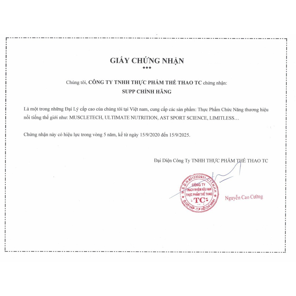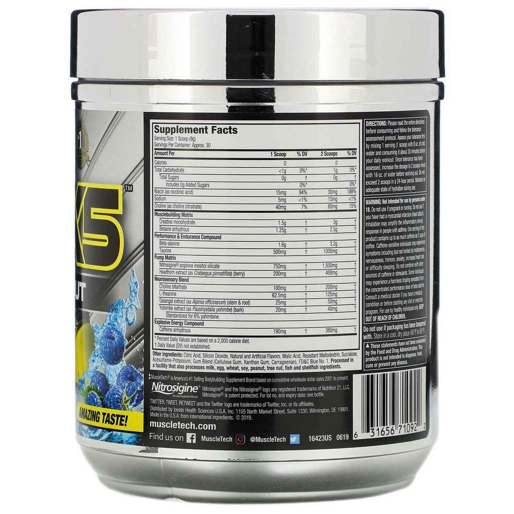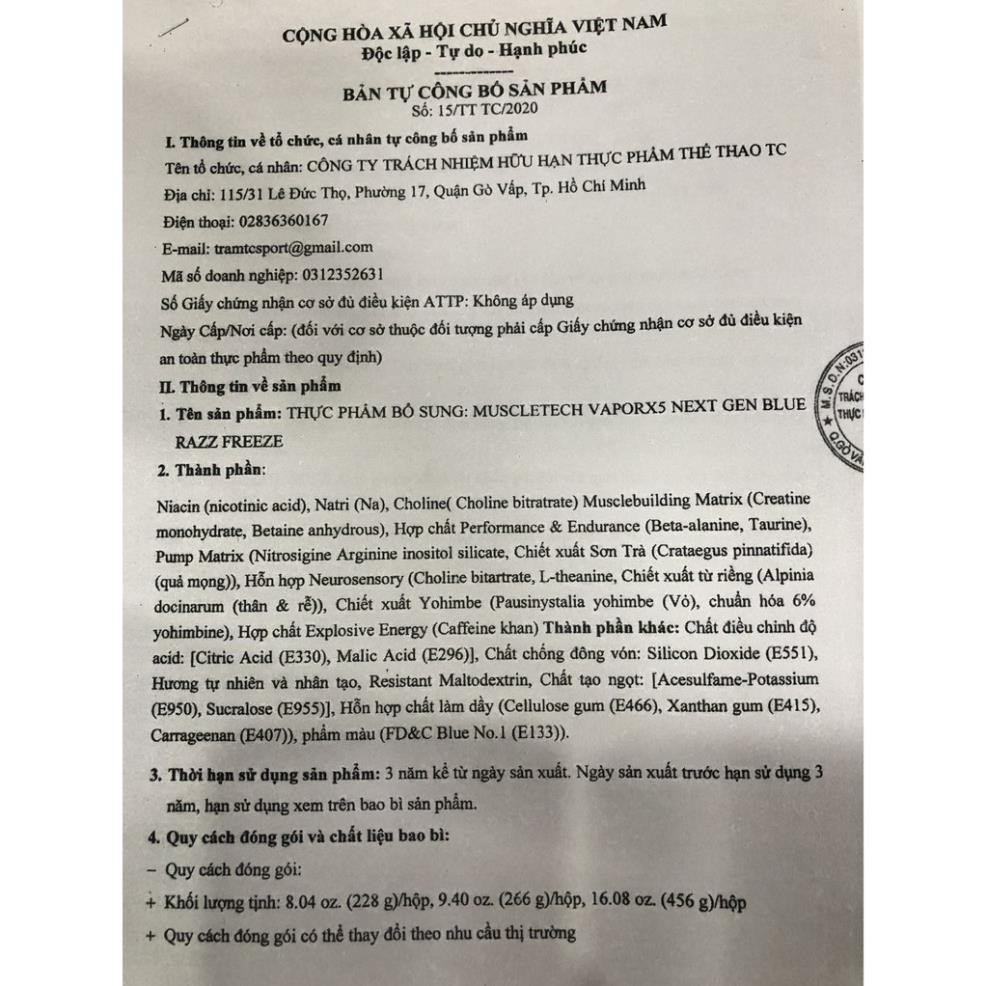 Lưu ý: Sản phẩm không phải là thuốc không có tác dụng thay thế thuốc chữa bệnh. HÀNG CÔNG TY – TEM NHÃN ĐẦY ĐỦ Các nhà nghiên cứu sản phẩm của MuscleTech ® đã cải tiến sản phẩm Pre-Workout. VaporX5 ™ Next Gen là sản phẩm trước khi tập luyện hoàn hảo nhất hiện nay. Nó cung cấp năng lượng vô song, pump (kích thích) cơ bắp ngay tức thì và hiệu suất tập luyện gia tăng đáng kể, Cảm giác siêu thực với sức mạnh cơ bắp. Công thức cường độ cao này có mọi thứ bạn có thể muốn trong một buổi tập luyện hăng say. VaporX5 ™ Next Gen mang lại hiệu quả và sức mạnh không mệt mỏi cho những cuộc tập luyện tốt nhất cho bạn. Sự kết hợp mạnh mẽ của choline, theanine và officinarum Alpinia cung cấp một trải nghiệm cảm giác duy nhất, trong khi một liều nghiên cứu lấy cảm hứng từ một phân tử caffeine cung cấp dồi dào năng lượng và tập trung cao độ. VaporX5 ™ Next Gen kết hợp sự pha trộn độc đáo và mạnh mẽ, các nhà nghiên cứu và phát triển sản phẩm của MuscleTech ® đã thêm beta-alanin vào sản phẩm. Taurine để tăng hiệu suất tập luyện và sức bền lâu hơn và ổn định hơn VaporX5 ™ Next Gen cung cấp hỗn hợp Nitrosigine ® và cây berry Hawthorn Berry được pha trộn trong sản phẩm để tăng nồng độ Oxit Nitric trong huyết tương, giúp thúc đẩy sự giãn mạch máu. Điều này giúp cho cơ bắp được pump nhanh nhất có thể. VaporX5 ™ Next Gen có mọi thứ bạn muốn để giúp tập trung sức mạnh. Một tiền chất dẫn truyền thần kinh được kết hợp với một lượng caffeine sẽ bùng nổ năng lượng giúp sức mạnh bạn gia tăng đáng kể và tăng cường sự tập trung cao độ của bạn. VaporX5 ™ Next Gen có các thành phần mạnh mẽ (betaine và creatine) theo đúng liều lượng khoa học đã được kiểm chứng. Để đảm bảo chất lượng và độ tinh khiết cao, VaporX5™ Next Gen phải trải qua kiểm tra chất lượng nghiêm ngặt, kiểm tra bởi bên phòng thí nghiệm thứ ba để đảm bảo rằng mỗi hộp đạt tiêu chuẩn chất lượng và chất lượng cao nhất. mẽ của các thành phần cảm giác với một liều lượng mạnh của một phân tử caffeine để có được trải nghiệm đột phá trước khi luyện tập và cảm giác quá tải bạn sẽ không thể tìm thấy ở bất cứ sản phẩm nào khác. HƯỚNG DẪN SỬ DỤNG Pha 1-2 muỗng với 8 oz – 16 oz (150ml – 300ml) nước lạnh trước khi tập luyện 30 phút mỗi ngày. Không sử dụng quá 2 muỗng trong 24 giờ. Giữ ẩm cơ thể và uống nước nhiều khi sử dụng. Không nên sử dụng trước khi đi ngủ 5 tiếng.