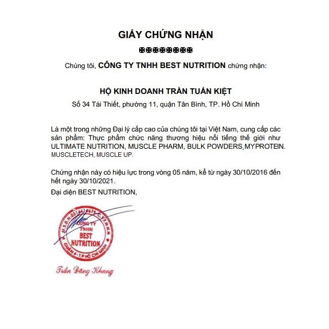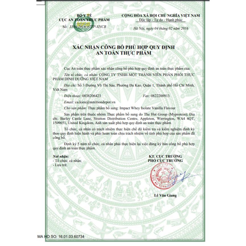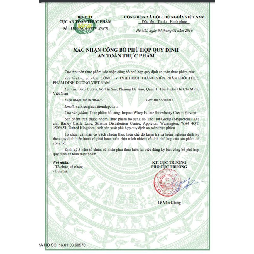 Đây là Thực phẩm bổ sung, không phải thuốc và không có tác dụng thay thế thuốc chữa bệnh Nguồn gốc, xuất xứ: + Sản xuất bởi MyProtein corp, UK (nước Anh). Công dụng: Whey protein isolate là đạm hấp thu nhanh, chiết xuất từ sữa động vật. Nó hỗ trợ người tập thể thao, thể hình tăng cân theo hướng tăng cơ hiệu quả. Bảo quản ở nơi khô ráo, thoáng mát, tránh tiếp xúc với ánh nắng mặt trời. HSD xem trên bao bì, 18 tháng kể từ ngày sản xuất