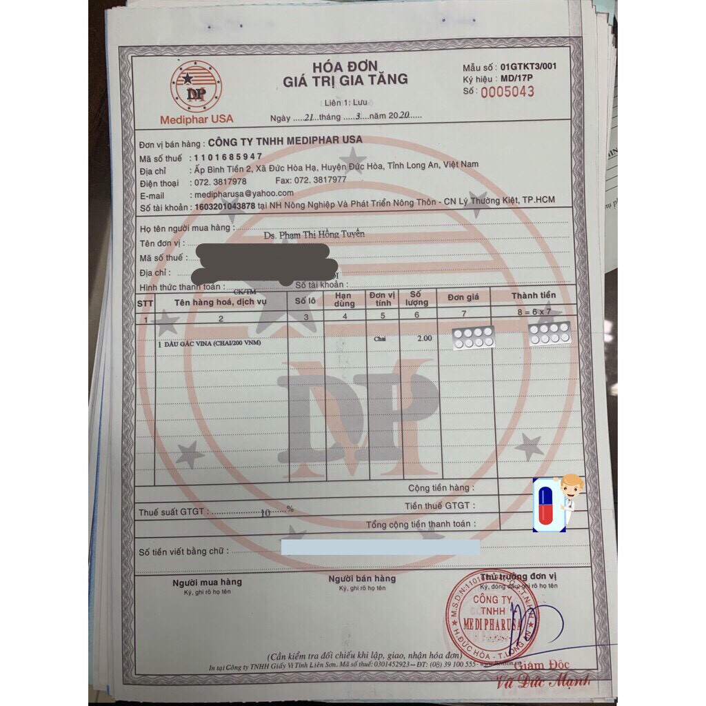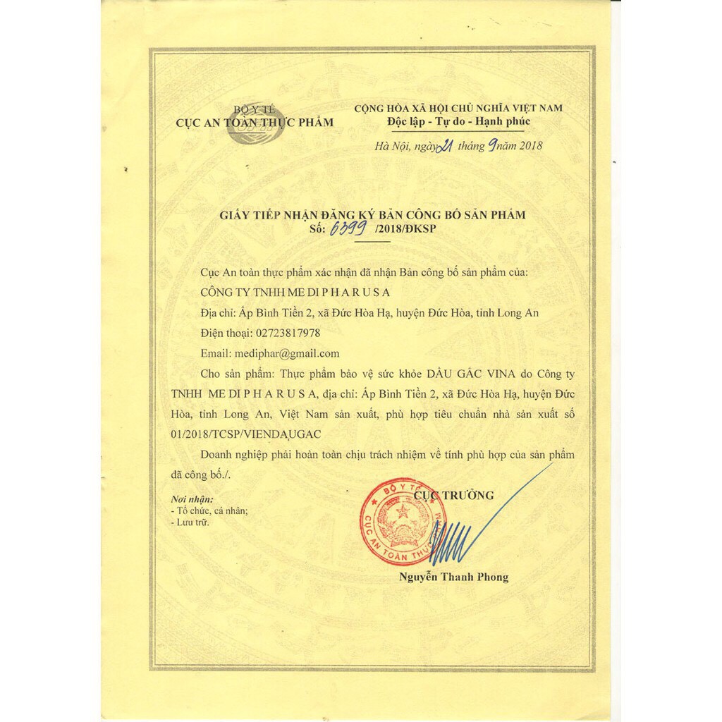 Viên uống bổ sung dưỡng chất cho mắt - Viên uống Dầu Gấc Vina (Viên Nang Mềm) - Lọ 200 viên THÀNH PHẦN: Mỗi viên nang mềm chứa Dầu gấc...........................................................400 mg Vitamin E..............................................................3 mg DHA......................................................................12 mg CÔNG DỤNG: - Bổ sung các dưỡng chất cho mắt, giúp tăng cường thị lực. Hỗ trợ làm giảm các triệu chứng mỏi mắt, mờ mắt, khô mắt. - Giúp chống oxy hóa, hỗ trợ làm chậm quá trình lão hóa mắt, tốt cho người bị đục thủy tinh thể, thoái hóa điểm vàng. ĐỐI TƯỢNG SỬ DỤNG: Dùng cho trẻ em và người lớn trong các trường hợp: Người bị mỏi mắt, mờ mắt, khô mắt do tiếp xúc nhiều máy tính, xem ti vi lâu, học sinh, sinh viên trong mùa thi cử phải học tập, đọc sách nhiều. Người bị suy giảm thị lực do quá trình lão hóa mắt: thoái hóa điểm vàng, đục thủy tinh thể. HƯỚNG DẪN SỬ DỤNG: Người lớn: uống 2 viên/lần, ngày 2 - 3 lần. Trẻ em từ 6 tuổi trở lên: uống 1 viên/lần, ngày 2 lần. CAM KẾT HÀNG CHÍNH HÃNG 100 % LIÊN HỆ SỐ ĐIỆN THOẠI 0868222879 LƯU Ý : SẢN PHẨM NÀY KHÔNG PHẢI LÀ THUỐC KHÔNG CÓ TÁC DỤNG THAY THẾ THUỐC CHỮA BỆNH