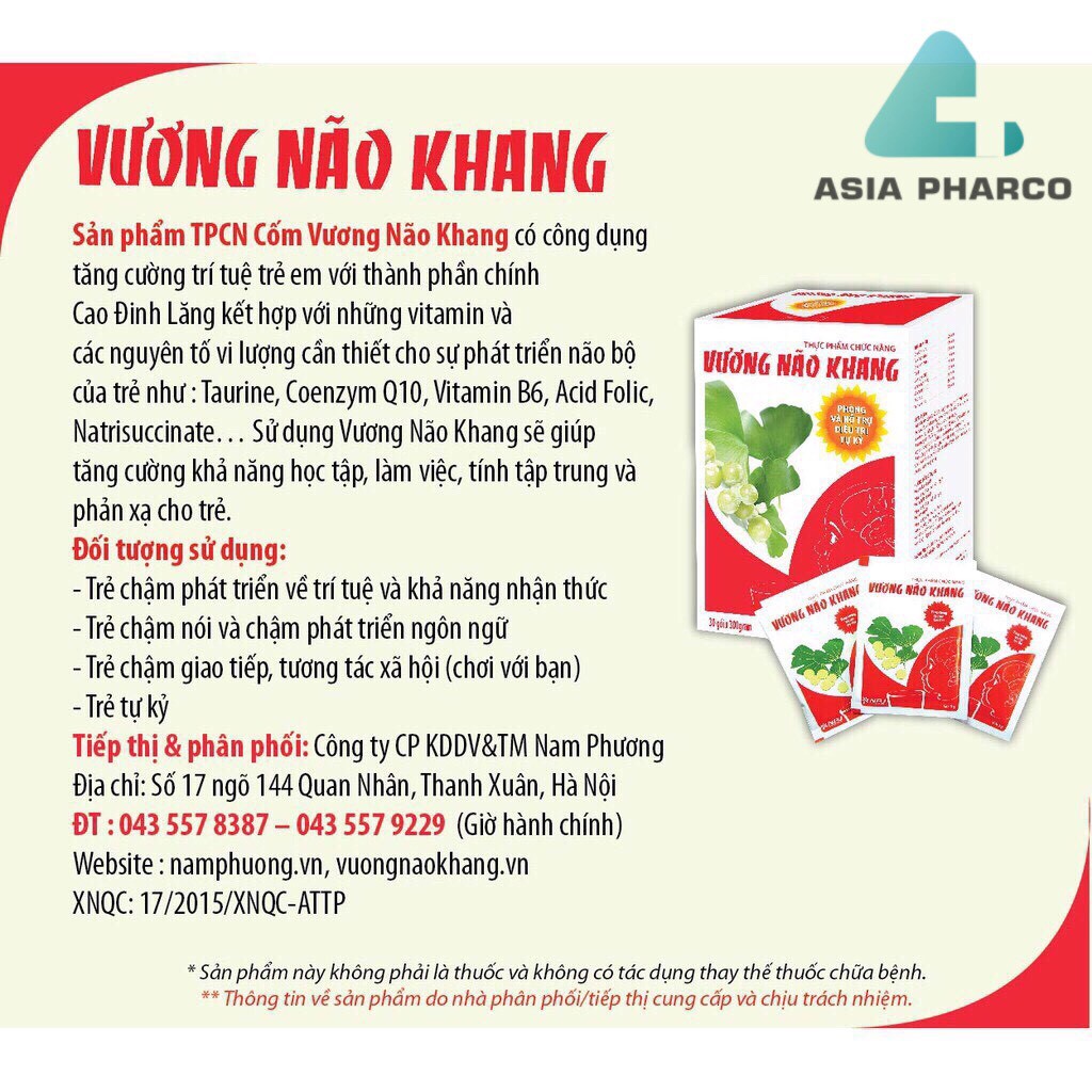 HÀNH PHẦN: Cao Đinh Lăng...........................................200 mg Cao Thăng Ma...........................................150 mg Cao Ginkgo biloba.......................................20 mg Natri succinate...........................................100 mg Taurine.........................................................40 mg Coenzyme Q10............................................2,5mg Vitamin B6..................................................0,3 mg Acid folic......................................................50 mg Dạng cốm CÔNG DỤNG: – Hoạt huyết, tăng cường vi chất và năng lượng cho não. – Giúp tăng cường khả năng học tập, làm việc, tính tập trung và phản xạ. – Hỗ trợ tăng cường trí tuệ trẻ em. ĐỐI TƯỢNG SỬ DỤNG: – Trẻ chậm phát triển về trí tuệ và khả năng nhận thức. – Trẻ chậm nói và chậm phát triển ngôn ngữ. – Trẻ em chậm giao tiếp, tương tác xã hội. – Trẻ em tự kỷ. HƯỚNG DẪN SỬ DỤNG Trẻ từ 09 tháng đến dưới 3 tuổi: Ngày uống 2 lần, mỗi lần ½ gói . Trẻ từ 3 đến 6 tuổi: Ngày uống 2 lần, mỗi lần 1 gói. Trẻ trên 6 tuổi: Ngày uống 2 lần, mỗi lần 2 gói. Nên uống trước bữa ăn 30 phút hoặc sau ăn 1 giờ. Nên dùng 1 đợt liên tục từ 3-6 tháng để có kết quả tốt nhất SẢN PHẨM KHÔNG PHẢI LÀ THUỐC KHÔNG CÓ TÁC DỤNG THAY THẾ THUỐC CHỮA BỆNH LIÊN HỆ SỐ ĐIỆN THOẠI 0868222879 CAM KẾT HÀNG CHÍNH HÃNG 100%