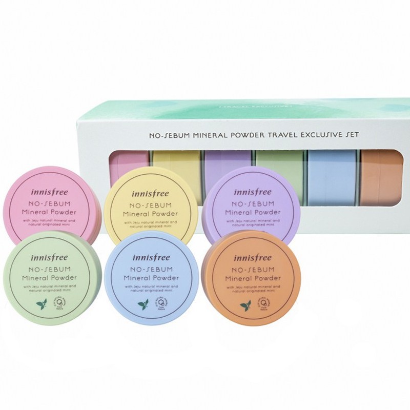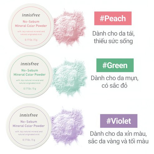 Phấn Phủ Innisfree Kiềm Dầu No-Sebum Thương hiệu: Innisfree Xuất xứ: Hàn Quốc Trọng lượng: Mini 5g, Full Size 8,5g Ưu điểm: - Rất thích hợp cho da dầu & da hỗn hợp - Có thể che khuyết điểm rất tốt - Nâng Tone da & Không làm trắng bệt da - Hạt phấn Micrro làm cho da mịn hơn Gồm 3 loại 1. Phấn_Phủ_No-Sebum_Mineral_Powder ( Màu Xanh Nhạt): Phấn phủ dạng nén, kiểm soát nhờn, có độ che phủ cao hơn phấn bột & làm mịn da. Dòng Mineral là dòng bán chạy nhất nên hãng Innisfree có thêm 2 phiên bản Mini 5g dạng bột: Phiên bản 6 màu và Phiên bản Thỏ Trắng, dòng này có giá rất tốt nên khi các bạn đặt shop sẽ gửi ngẫu nhiên nhe. 2. Phấn_Phủ_Innisfre_No_Sebum_Moisture_Powder (Màu Tím Nhạt): Phấn phủ dạng #bột, bột có màu da, kiểm soát nhờn tốt, sử dụng kèm cọ trang điểm, phấn rất mịn nên che khuyết điểm khá tốt. 3. Phấn_Phủ_Innisfre_No_Sebum_Blur_Powder (Màu Trắng): Phấn phủ dạng #bột, che khuyết điểm cao hơn, cho cả da có lổ chân lông to. ++ Thành Phần: Mica, tinh bột ngô biến tính, tổng hợp Flourphlogopite, Boron Nitride, Dimethicone / Vinyl Dimethicone Crosspolymer, Polymetyl Methacrylate, Vinyl Dimethicone / Methicone silsesquioxan Crosspolymer, 1,2-Hexanediol, Chiết xuất trái cây Chospyros Kaki, Chiết xuất vỏ cam quýt, Glyceryl Caprylate, Chiết xuất hoa lan, Chiết xuất lá Camellia Sinensis, Chiết xuất lá Camellia Japonica, Lauroyl Lysine, Muối khoáng, Chiết xuất lá Menta Arvensis, Chiết xuất trái cây Opuntia Coccinellifera, Silica, Ethylhexyl Glycerin, Nước tinh khiết, Propanediol, Hương thơm.
