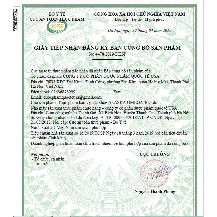 THÀNH PHẦN: Fish oil..............................................1000 mg EPA (Eicosapentaenoic acid)......180 mg DHA (Docosahexaenoic acid).....120 mg Dầu gấc……………………………200mg Evening primrose oil ( Tinh dầu hoa anh thảo).....120 mg Flaxseed oil ( dầu hạt lanh)...................120 mg Coenzym Q10.....................................10 mg Vitamin E............................................20 IU Phụ liệu: chất nhũ hóa lecithin, dầu đậu nành, chất giữ ẩm glycerin, chất làm bóng sáp ong,gelatin vừa đủ hai viên CÔNG DỤNG: Giúp bổ sung các acid béo không no và chất oxy hóa cho cơ thể, Hỗ trợ cải thiện thị lực, giảm nguy cơ sơ vữa mạch máu do tác hại của oxy hóa. ĐỐI TƯỢNG SỬ DUNG: Người muốn duy trì sức khỏe tim mạch và mắt. CÁCH DÙNG: Trẻ em trên 6 tuổi: 1-2 viên/ lần, ngày 1-2 lần/ ngày Người lớn: uống 2 viên/ lần, ngày 2-3 lần/ ngày Uống sau ăn. HẠN SỬ DỤNG: • Xem trên bao bì sản phẩm LƯU Ý: • Sản phẩm này không phải là thuốc và không có tác dụng thay thế thuốc chữa bệnh !!! Sản xuất tại : CÔNG TY CỔ PHẦN DƯỢC PHẨM QUỐC TẾ USA Địa chỉ : CNN thanh oai, Hà Nội .
