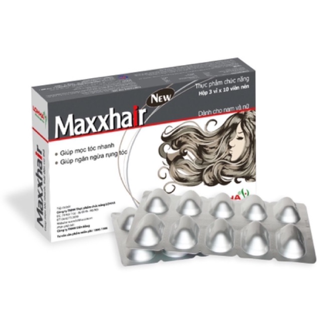 Bổ sung Vitamin và khoáng chất giúp tăng cường sức khỏe của tóc; hỗ trợ mọc tóc nhanh, chắc khỏe, suôn mượt và bóng đẹp, hỗ trợ ngăn ngừa rụng tóc, đồng thời hỗ trợ thải độc do ảnh hưởng của các hóa chất sử dụng cho tóc (thuốc nhuộm, uốn, ép tóc,…). * HỘP 30 VIÊN THÀNH PHẦN: Immune-Gamma®:…...........25mg Cao Hà thủ ô đỏ:………........150mg Cao Hoàng cầm: ……..........150mg Cao Thổ phục linh: ….........125mg L-Arginine: ……………….............75mg L-Carnitine fumarate:...........50mg Kẽm (Zn): …………………..............5mg Vitamin B5: …………….............3,5mg Biotine:…………………...............20mcg CÔNG DỤNG: Bổ sung Vitamin và khoáng chất giúp tăng cường sức khỏe của tóc. Hỗ trợ mọc tóc nhanh, chắc khỏe, suôn mượt và bóng đẹp; hỗ trợ ngăn ngừa rụng tóc. Hỗ trợ thải độc do ảnh hưởng của các hóa chất sử dụng cho tóc (thuốc nhuộm, uốn, ép tóc,…) ĐỐI TƯỢNG SỬ DỤNG: Maxxhair dùng cho các trường hợp rụng tóc nhiều và sau rụng tóc do các nguyên nhân: thay đổi nội tiết, lão hóa, sử dụng các loại thuốc, hóa chất, thiếu dinh dưỡng, làm việc căng thẳng, thay đổi nguồn nước, hoặc tóc rụng nhiều không có nguyên nhân, những người tóc thưa, xơ, chẻ ngọn, tóc có nhiều dầu. Người có nguy cơ hói đầu và bệnh nhân rụng tóc sau thời gian hóa trị, xạ trị ung thư,… HƯỚNG DẪN SỬ DỤNG Hỗ trợ giảm rụng tóc: 4 viên/ngày, chia 2 lần. Giúp phòng ngừa rụng tóc: 2 viên/ngày, chia 2 lần. Hỗ trợ thải độc hóa chất cho cơ thể: uống 1 tuần sau mỗi lần nhuộm, ép tóc, mỗi ngày 4 viên chia 2 lần; sau đó duy trì mỗi ngày 2 viên cho 2 tuần tiếp theo. Để cho có hiệu quả tốt nhất, nên uống Maxxhair ngay sau khi ăn. Nên sử dụng liên tục một đợt từ 1-3 tháng để có kết quả tốt nhất * Maxxhair dùng được cho cả Nam và Nữ SẢN PHẨM KHÔNG PHẢI LÀ THUỐC , không có tác cụng thay thế thuốc chữa bệnh. Sản phẩm được phân phối bởi Công ty Cổ phần Dược Phẩm Thái Minh SẢN XUẤT TẠI VIỆT NAM #maxxhair #moctoc #tpcn
