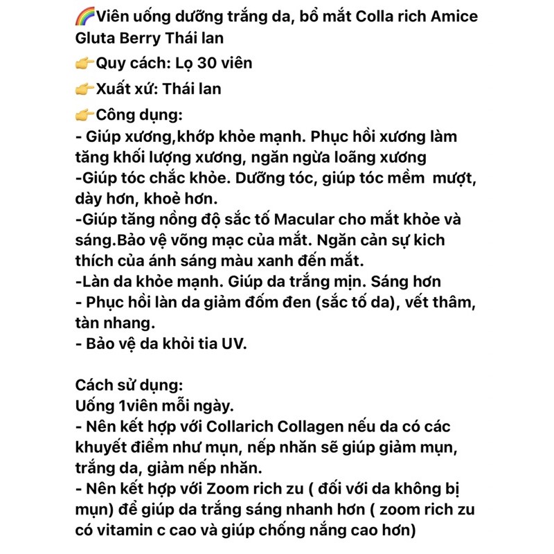 01 hủ tuỳ chọn Xuất xứ : Thái Lan Dung tích : 30 viên Công dụng : trắg, giảm mụn, đẹp da Hướng dẫn sử dụng : hủ đen : 2 viên mỗi ngày hủ cam : 1 viên mỗi ngày hủ hồng : 1 viên mỗi ngày Hạn sử dụng : in trên bao bì