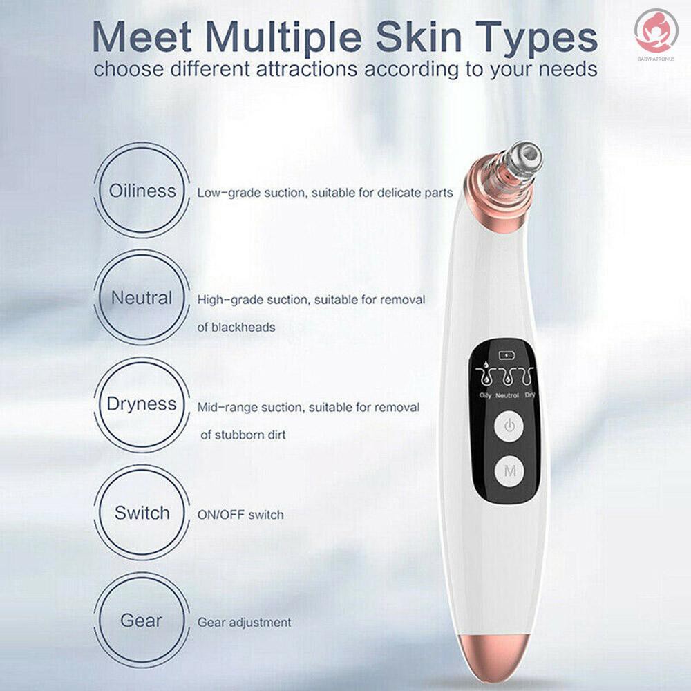 The electric machine with 6 beauty heads is practical tool to remove blackhead, dead skin, acne and clean face deeply. It is suitable for different type of skin. Features: Three adjustable suction levels, suitable for different type of skin. Six kinds of different beauty heads to exfoliate dead skin and remove blackhead. Easily remove blackhead, acne and clean face deeply, it can also increase blood circulation, minimizes wrinkle effectively and keeping young. Skin-friendly, made by high-quality ABS material, safe and non-irritate, also suit for sensitive skin. Rechargeable USB charge, you can charge the pore cleanser machine with USB cable anywhere. Small size and portable, convenient to carry in your bag. Specifications: Material: ABS + PC Color: Rose gold + white as shown Rated Power: 2.5W Lithium Cell: 400mAh Charge Time: About 2-3H Working Time: About 200min (Actual use time may vary due to the different use frequency and gears) Item size: 196.6 * 38.5mm / 7.74 * 1.52in Item Weight: 107g / 3.77ounces Package Weight: 173g / 6.1ounces Package Size: 220 * 45 * 43mm / 8.66 * 1.77 * 1.69in Functions: Microcrystalline head: Without harm to the skin, it can exfoliate dead skin. (use in forehead, cheek and jaw) Large round hole head: Big round head with strong suction characteristics has a significant effect on the fat blackhead. (use in forehead, cheek and jaw) Small round head: Suction is a bit weaker, it is suitable for sensitive skin. (use in nose) The flliptical hole head: Removes blackheads and lifts the skin. Mini Round Head: Suitable for novice sensitive skin. Medium round hole head: Suitable for comedones and excessive. Warning Tips: 1. Due to the powerful suction, it is recommended NOT to stay in the same area for 2 seconds. 2. People who have injuries or scar are NOT recommended. 3. Each time of using this beauty machine not more than 5 minutes. 4. Please don't use it on scarred skin. Don't wash the device. Packing List: 1 * Electric Blackhead Remover 6 * Beauty Heads 1 * USB Cable 1 * User Manual