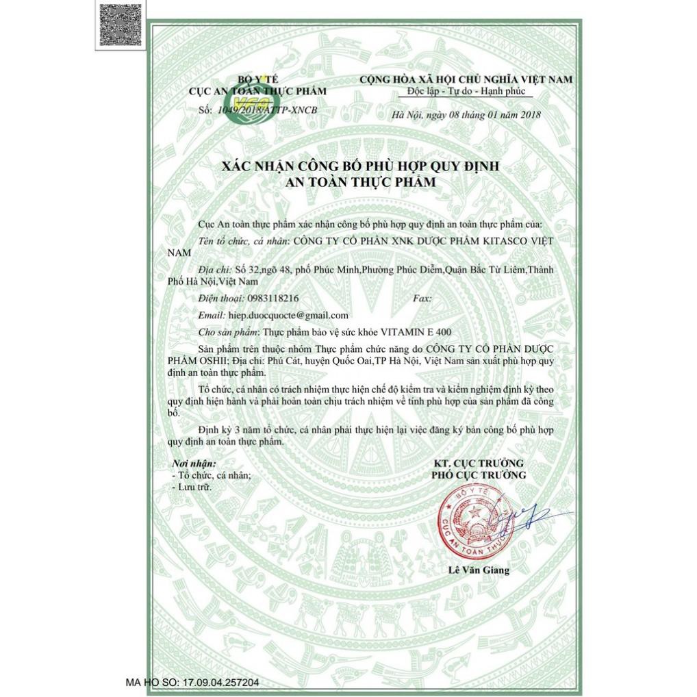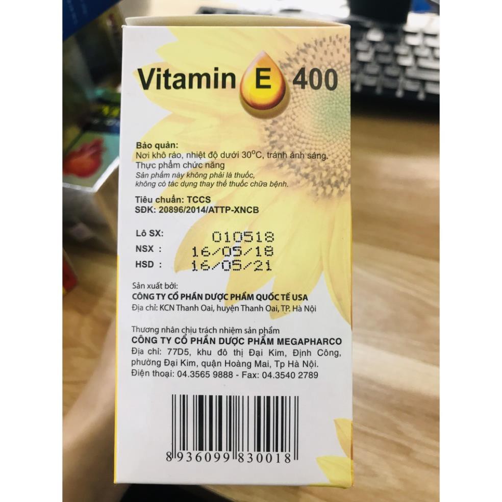 Sản phẩm này không phải là thuốc và không có tác dụng thay thế thuốc chữa bệnh Tên sản phẩm: Viên uống đẹp da - Vitamin E Quy cách: Hộp 100 viên Xuất xứ: Việt Nam Viên uống đẹp da - Vitamin E NHÃN HIỆU ĐƯỢC BÁC SĨ KHUYÊN DÙNG ✅NGUYÊN LIỆU NHẬP KHẨU TỪ MỸ ✅THÀNH PHẦN: Vitamin E................................. 4000mcg Aloe vera ...................................... 500mg ✅CÔNG DỤNG Viên uống đẹp da - Vitamin E - Bổ sung Vitamin E cho cơ thể, giúp hỗ trợ điều trị các triệu chứng do thiếu Vitamin E. Hỗ trợ giảm các tình trạng rạn da, da khô,nứt nẻ, nếp nhăn , sẹo, nuôi dưỡng móng tóc chắc khỏe, giúp da săn chắc mịn màng. Giúp hạn chế quá trình lão hóa, bảo vệ các sợi collagen,làm chậm tiến trình lão hóa của cơ thể ✅ĐỐI TƯỢNG SỬ DỤNG: Người lớn và trẻ em trên 10 tuổi, người thiếu vitamin E, người làm việc trong môi trường tiếp xúc nhiều ánh sáng và tia tử ngoại. Phụ nữ da khô, nứt nẻ, quầng mắt, móng tóc yếu dễ gãy rụng. Dùng cho phụ nữ nám da, sạm da, tàn nhang: Sản phẩm giúp phục hồi, cải thiện sức khỏe làn da Sử dụng phòng ngừa nám da, chống lão hóa, giảm nếp nhăn, làm đẹp da: Khả năng chống hóa giúp làm chậm quá trình lão hóa làn da và cơ thể. Bổ sung hàng ngày cho phụ nữ để làm giảm đau bụng kinh, ngăn ngừa ung thư vú, buồng trứng. Cải thiện sức khỏe tình dục, hỗ trợ cho các đối tượng đang sử dụng các phương pháp điều trị hiếm muộn, vô sinh. Dùng để bổ sung và nâng cao sức khỏe sinh sản cho phụ nữ trong thời kỳ thai nghén, mang thai Người thiếu hụt Vitamin E. Bổ sung vào khẩu phần ăn để ngăn ngừa tình trạng thiếu hụt vitamin E ✅CÁCH DÙNG: Uống 2 viên/lần, 1-2 lần/ngày. ✅QUY CÁC ĐÓNG GÓI: Hộp 10 vỉ x 10 viên Nhà sản xuất: CÔNG TY CỔ PHẦN DƯỢC PHẨM QUỐC TẾ USA #vienuongdepda #vienuongtrangda #vienuongdepdacollagen #vienuongtrangdaphap #vienuongvitamin #vitamine #vienuongcollagen #vitamin #bosungvitamin