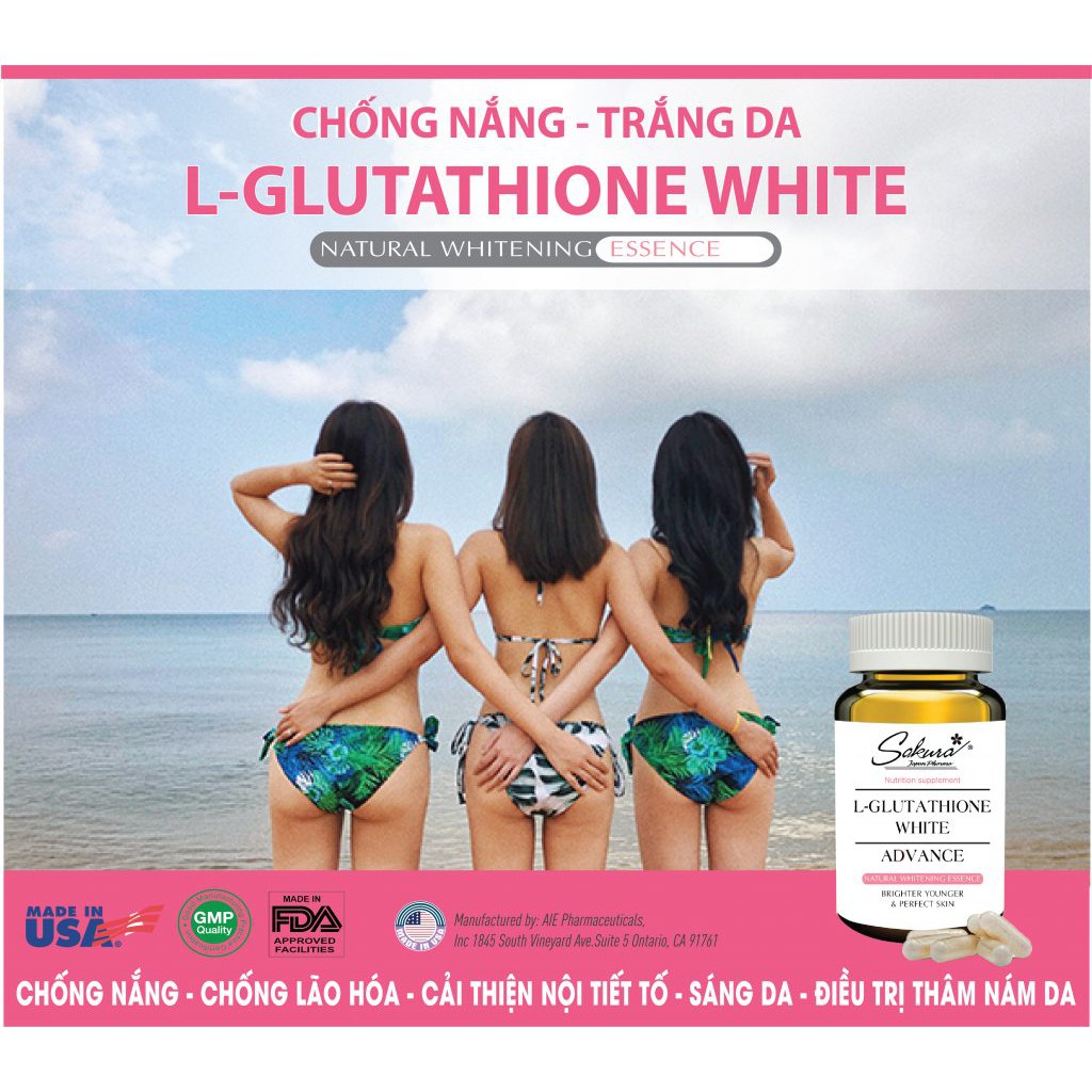 Quy Cách Viên Dưỡng Da Sakura L Glutathione White Advance: Hộp 30 viên Thành Phần Viên Dưỡng Da Sakura L Glutathione White Advance: L- Glutamic................................................................180mg L- Glycine..................................................................180mg L- Cystine..................................................................180mg Polypodium Leucotomos...........................................240mg Punica granatum.........................................................60mg Vitamin C...................................................................100mg Vitamin B3...................................................................40mg Collagen....................................................................140mg Black Cohosh............................................................100mg Gamiana Leaf Powder Extract...................................100mg Công Dụng Viên Dưỡng Da Sakura L Glutathione White Advance: Giúp giảm nám an toàn Làm trắng da Hỗ trợ chống nắng bảo vệ da Giúp săn chắc, nâng cơ & trẻ hóa da, cải thiện tinh thần luôn vui vẻ Ai Nên Dùng Viên Dưỡng Da Sakura L Glutathione White Advance: Người từ 12 tuổi trở lên có nhu cầu cải thiện làn da Người có những vấn đề như: thâm nám, sạm da, da có dấu hiệu lão hóa Người muốn chống nắng, cải thiện nội tiết tố, giảm stress Liều & Cách Dùng Viên Dưỡng Da Sakura L Glutathione White Advance: Uống 1 viên/ngày vào buổi sáng hoặc tối, để đạt hiệu quả tốt nhất nên dùng trước bữa ăn *Lưu ý: - Sản phẩm không phải là thuốc và không có chức năng thay thế thuốc chữa bệnh - Tác dụng của sản phẩm tùy thuộc vào sự hấp thu của từng người