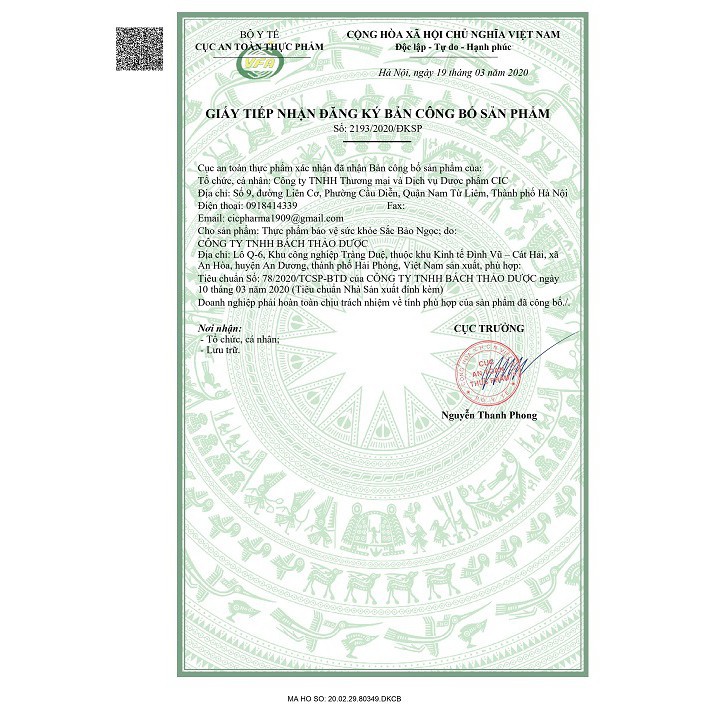 SẮC BẢO NGỌC là Viên uống trắng da Collagen thủy phân đầu tiên tại Việt Nam, sản phẩm hỗ trợ làm trắng da, làm mờ nám tàn nhang, hết đen sạm và trẻ hóa làn da. Sản phẩm do Công ty TNHH TM & DV Dược Phẩm CIC nghiên cứu và sản xuất trên công nghệ hiện đại nhất hiện nay. SẮC BẢO NGỌC mang lại sự tự tin cho phụ nữ, giúp phái đẹp lấy lại làn da trắng hồng như tuổi đôi mươi. Sắc Bảo Ngọc được sản xuất tại nhà máy Bách Thảo Dược, nhà máy đạt tiêu chuẩn GMP quốc tế. *Thành phần đặc biệt: L-Glutathione, Alpha lipoic acid, Chiết xuất Mầm đậu nành (Isoflavon), Collagen Peptid (từ Cá Tuyết), Vitamin E, Cao khô thục địa, Vitamin C.... *Công dụng: Giúp da Trắng sáng bật tông, Sạch nám hoàn toàn, Trẻ hoá làn da, Chống oxy hóa và cải thiện tình trạng suy giảm nội tiết tố nữ, giúp hạn chế lão hóa da, giảm nám, vết nhăn, sạm da, giúp làm đẹp da. *Cách Dùng: Uống 2 viên/lần, ngày 2-3 lần. Uống lúc đói. Sản phẩm này không phải là thuốc và không có tác dụng thay thế thuốc chữa bệnh.