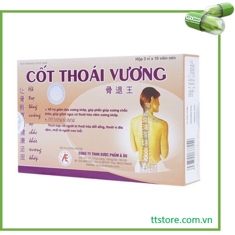 THÀNH PHẦN: Mỗi viên Cốt Thoái Vương chứa: Cao Thiên niên kiện 300mg Glycine 100mg MSM (Methylsulfonylmethane) 80mg Chiết xuất Nhũ hương 50mg Canxi 30mg Magie 5,8mg Dầu Vẹm xanh 1mg Vitamin B1 0,5mg Vitamin B2 0,5mg Vitamin K2 10mcg CÔNG DỤNG - Bổ sung dưỡng chất cho khớp, tăng cường sự chắc khỏe của xương khớp. - Hỗ trợ làm giảm đau nhức khớp, giúp làm giảm nguy cơ thoái hóa, viêm xương khớp. ĐỐI TƯỢNG SỬ DỤNG Người bị thoái hóa đốt sống, thoát vị đĩa đệm, nhất là người cao tuổi. CÁCH DÙNG Ngày uống 4 viên, chia làm 2 lần; 30 phút trước khi ăn hoặc sau khi ăn 1 giờ. Một đợt sử dụng nên kéo dài từ 2-3 tháng. Sản phẩm này không phải là thuốc, không có tác dụng thay thế thuốc chữa bệnh. Bảo quản: Nơi khô ráo thoáng mát, tránh ánh nắng trực tiếp. Hạn sử dụng: 36 tháng kể từ ngày sản xuất. Ngày sản xuất và Hạn sử dụng in trên bao bì. Quy cách đóng gói: Hộp 3 vỉ x 10 viên nén. Sản xuất tại: CÔNG TY TNHH TƯ VẤN Y DƯỢC QUỐC TẾ Xuất xứ: Việt Nam #cốt_thoái_vương #thoát_vị_đĩa_đêm #đau_lưng