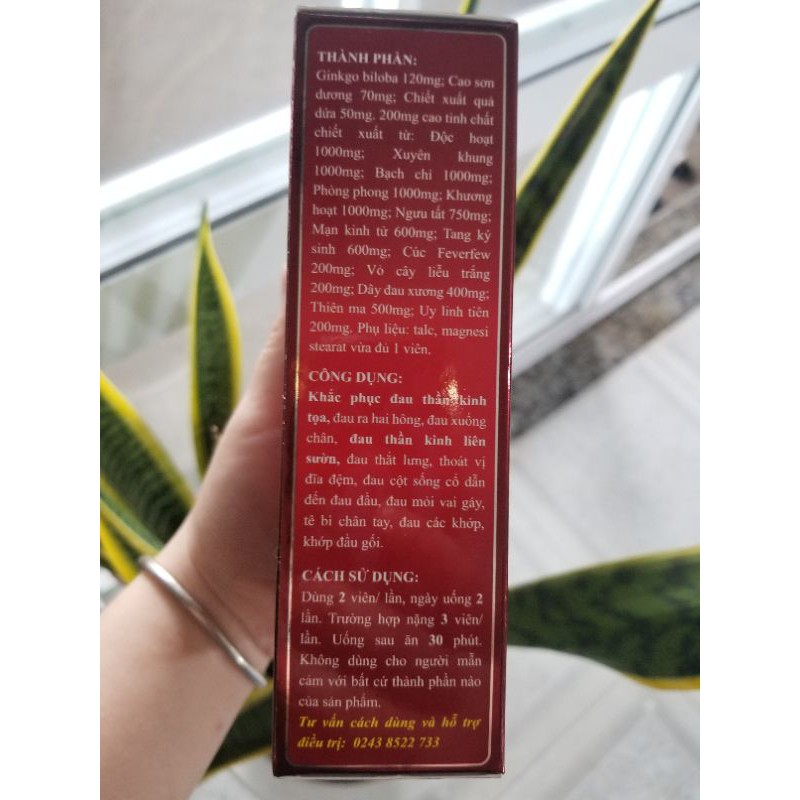 ✅CÔNG DỤNG: – Khắc phục đau dây dây thần kinh tọa, đau ra hai hông, đau xuống chân. – Giúp giảm đau dây thầm kinh liên sườn, đau thắt lưng, thoát vị đĩa đệm. – Giúp giảm đau cột sống cổ dẫn đến đau đầu, đau mỏi vai gáy– Giúp giảm tê bì chân tay, đau các khớp, khớp đầu gối. ✅ĐỐI TƯỢNG SỬ DỤNG: – Người bị đau dây thần kinh tọa : đau dọc thắt lưng lan xuống chân, đau lưng khi cười, ho, khó cúi, đau khi nghiêng người. – Người bị đau khi đứng nhiều hoặc thay đổi thời tiết. – Người bị tê mỏi chân tay, đau cứng cổ, đau nhức vùng bả vai, đau đầu, chóng mặt. – Người bị đau nhức khớp gối, cử động khó khăn khi thay đổi tư thế đứng lên, ngồi xuống. – Người bị cứng khớp, khó co duỗi các khớp, đầu khớp nóng đỏ. – Người bị thoái hóa khớp, viêm khớp, thoát vị đĩa đệm. ✅ HƯỚNG DẪN SỬ DỤNG: – Uống 2 viên / lần , ngày uống 2 lần. Trường hợp nặng uống 3 viên lần. – Uống sau ăn 30 phút #thầnkinhtọa. #đauthầnkinhliênsườn #thoáivịđịađiệm lưu ý: đây không phải là thuốc không thay thế thuốc chữa bệnh.