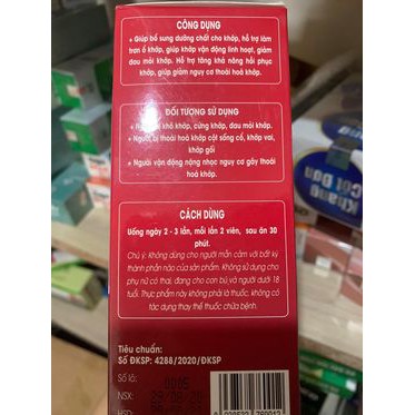 công dụng giúp bổ sung dịch khớp, giúp khớp vận động linh hoạt, tái tạo mô sụn khớp Sản phẩm từ thảo dược tự nhiên an toàn không gây tác dụng phụ Sử dụng ngày 4 viên chia 2 lần uống sau ăn 30p Lọ 60 viên