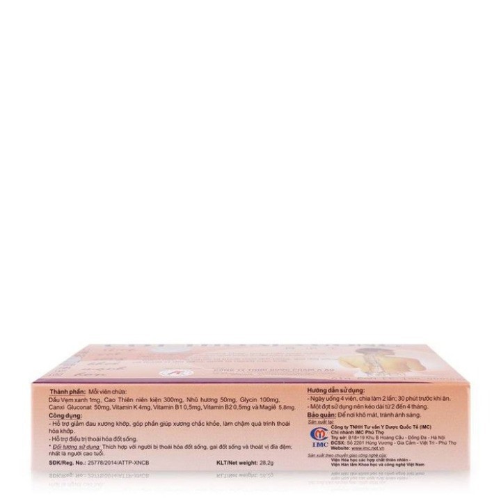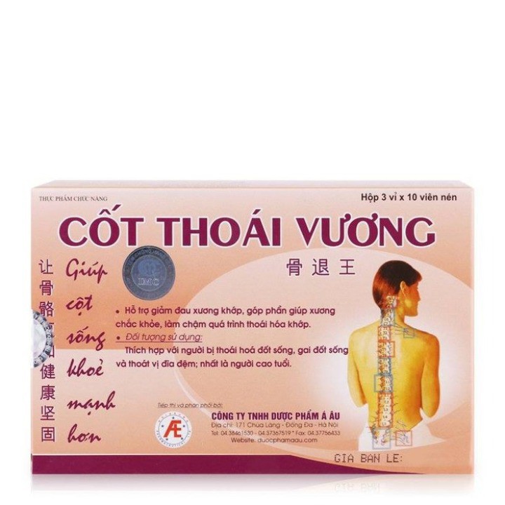 " Viên uống bổ khớp ❤️CHÍNH HÃNG👍 Cốt Thoái Vương ✅ Tên sản phẩm: Cốt Thoái Vương Quy cách: Hộp 30 viên Thương hiệu: Dược Phẩm Á Âu Xuất xứ: Việt Nam ✅ THÔNG TIN SẢN PHẨM Thực phẩm chức năng Cốt Thoái Vương là sản phẩm được chiết xuất từ thành phần chính là dầu vẹm xanh có hoạt tính sinh học cao kết hợp với các loại thảo dược tự nhiên tạo thành công thức toàn diện hỗ trợ giảm đau xương khớp, giúp xương chắc khỏe, làm chậm quá trình thoái hóa khớp đồng thời hỗ trợ thoái hóa đốt sống. Sản phẩm thích hợp với người bị thoái hóa, gai đốt sống và thoát vị đĩa đệm, đặc biệt là người cao tuổi. ✅ Thành phần của viên uống Cốt Thoái Vương Dầu vẹm xanh 1mg Cao Thiên niên kiện 300mg Nhũ hương 50mg Glycin 100mg Canxi Gluconat 50mg Vitamin K 4mg Vitamin 5mg Vitamin B2 0,5mg Magie 5,8mg ✅ Công dụng của viên uống Cốt Thoái Vương Hỗ trợ giảm đau xương khớp, góp phần giúp xương khớp chắc khỏe, Hỗ trợ thoái hóa đốt sống, làm chậm quá trình thoái hóa khớp. Hỗ trợ gai đốt sống và thoát vị đĩa đệm, nhất là người cao tuổi. ✅ Đối tượng sử dụng của viên uống Cốt Thoái Vương Thích hợp với người bị thoái hóa đốt sống, gai đốt sống và thoát vị đĩa đệm. Người bị thoái hóa xương khớp, nhất là người cao tuổi. Người bị đau nhức xương khớp, viêm khớp. Người gặp các vấn đề về xương khớp. ✅ Hướng dẫn sử dụng viên uống Cốt Thoái Vương Ngày uống 4 viên, chia làm 2 lần, 30 phút trước khi ăn. Mỗi đợt sử dụng nên kéo dài từ 2 đến 4 tháng. Lưu ý Tác dụng của sản phẩm có thể khác nhau tùy cơ địa người dùng. Nên kết hợp chế độ ăn uống lành mạnh và luyện tập khoa học để có sức khỏe xương khớp tốt nhất. ✅ Cam Kết Từ Shop + Hàng thật như hình + Check mã vạch thoải mái + Kiểm hàng thu tiền tại nhà + Giá cả cực kì cạnh tranh + Giao hàng và ship COD toàn quốc ✅ ĐẾN VỚI MỘC DIỆP BẠN ĐƯỢC QUYỀN LỢI GÌ? - Nhà thuố.c MỘC DIỆP đảm bảo hàng chính hãng - ĐỔI hàng 1 đổi 1 miễn phí trong vòng 7 ngày nếu hàng phát hiện lỗi từ sản phẩm - Tư vấn sức khỏe miễn phí HotLine: 0962.079.530 CẢM ƠN ANH/CHỊ ĐÃ ỦNG HỘ SHOP EM Ạ ^^ #mocdiep #nhathuocmocdiep #thucphamchosuckhoe #thucphamchucnang #myphamchinhhang #chamsocsuckhoe #suckhoebabau #suckhoechobe #suckhoenguoigia #hotroxuongkhop #bokhop ""Sản phẩm này không phải là Thuốc và không có tác dụng thay thế Thuốc chữa bệnh"""