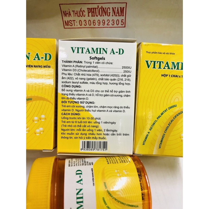 Vitamin AD-Chai 100viên.Xem hướng dẫn sử dụng trên hình ảnh sản phẩm shop Phương Nam thiên nhiên việt chụp.Hạn sử dụng : 3 năm kể từ ngày sản xuất in trên bao bì(date luôn mới)