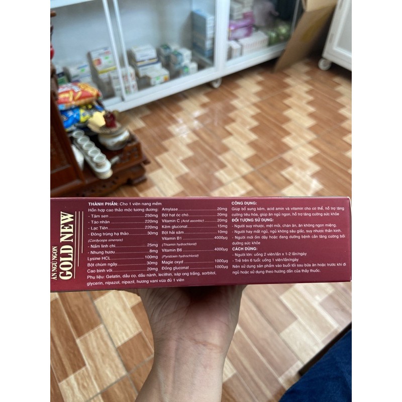 Hộp 60 viên Công dụng: giúp tăng cường tiêu hoá, ăn ngủ ngon, tăng cường sức khoẻ Thành phần: Tâm sen, táo nhân, lạc tiên, đông trùng hạ thảo, nấm linh chi, nhung hươu, lysine, chùm ngây, bình vôi và các vitamin Cách dùng: uống 2 viên sau khi ăn tối Sản phẩm này không phải là thuốc và không có tác dụng thay thế thuốc chữa bệnh #anngungon #boibosuckhoe #nhansam