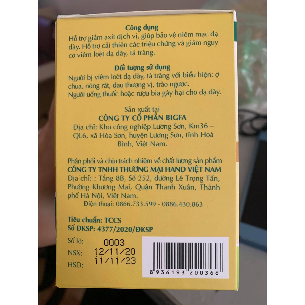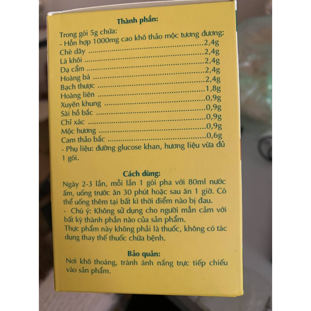 Cách dùng: Ngày dùng 2-3 lần, mỗi lần 1 gói pha với 80ml nước ấm, uống trước ăn 30 phút hoặc sau ăn 1 giờ. Có thể uống thêm tại bất kỳ thời điểm nào bị đau. Quy cách: hộp 30 gói