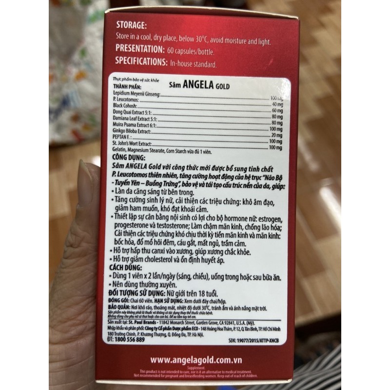 Hộp 60 viên Công dụng: sáng da, tăng cường nội tiết tố, giảm khô hạn, làm chậm mãn kinh, giúp xương chắc khoẻ, giảm mất ngủ, trầm cảm, cáu gắt Thành phần: xem trên bao bì Cách dùng: ngày uống 2 viên sáng chiều Sản phẩm này không phải là thuốc và không có tác dụng thay thế thuốc chữa bệnh #angela gold