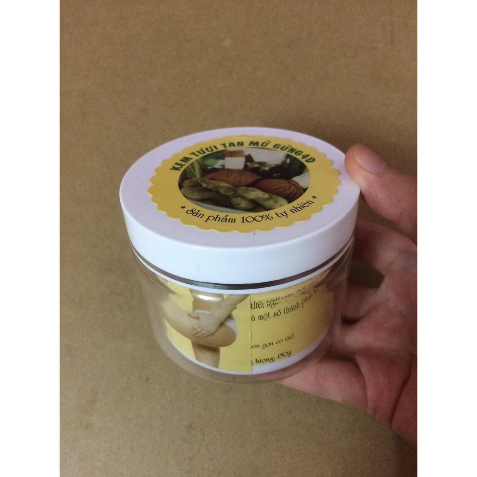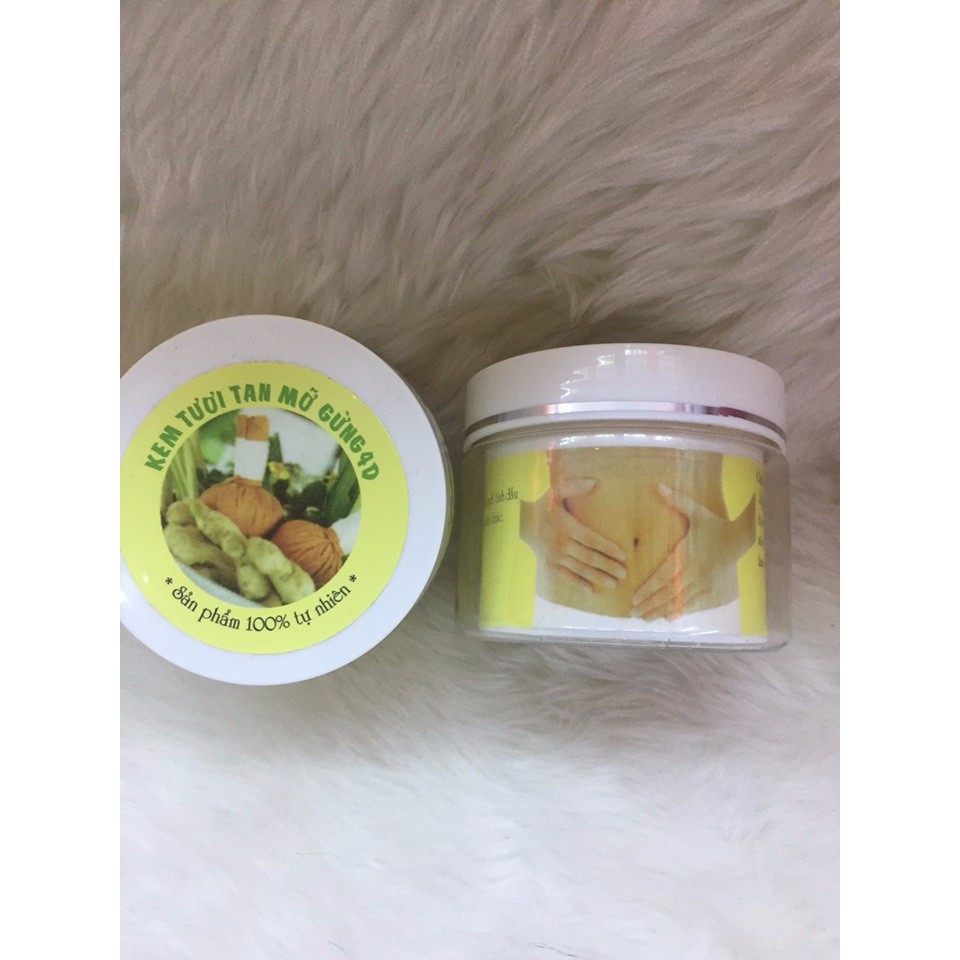 Kem Tan Mỡ Gừng 4D 150g Xuất xứ: Việt Nam +100% tự nhiên. +Thành phần chính: -Tinh chất rừng tươi,muối khô,ngải cứu,bột quế,tinh dầu hoa hướng dương,vitamin E,...và một số thành phần khác. +Tác dụng: Xua tan mọi mỡ thừa trong cơ thể,mang lại cho bạn một cơ thể thon gọn và săn chắc.