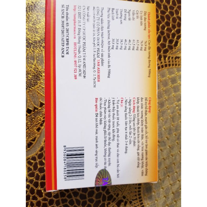 ✅Đối tượng sử dụng: - Dùng cho người già phong thấp. - Người bị đau nhức xương khớp toàn thân, viêm khớp, thoái hóa khớp. - Thoái hóa cột sống, gai cột sống. ✅Công dụng: Hỗ trợ bổ thận, mạnh gân cốt, hỗ trợ làm giảm các triệu chứng đau nhức xương khớp toàn thân, vôi hóa xương khớp, viêm khớp, thoái hóa khớp, thoái hóa cột sống, gai cột sống. ✅Cách dùng: Uống sau khi ăn 30 phút. - Ngày uống 2-3 lần, mỗi lần 2 viên. - Nên uống liên tục ít nhất 3-4 tháng. Lưu ý: Trẻ em dưới 8 tuổi, phụ nữ có thai bà cho con bú cần hỏi ý kiến thầy thuốc trước khi dùng. - Thực phẩm này không phải là thuốc, không có tác dụng thay thế thuốc chữa bệnh.