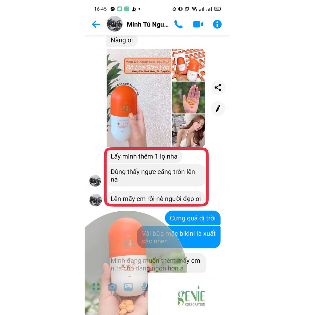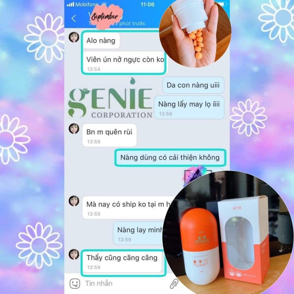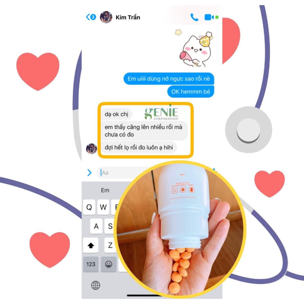 Hãng sản xuất: Genie Xuất xứ: Hàn Quốc Công dụng sản phẩm: Công dụng chính của sản phẩm giúp chị em phụ nữ có bộ ngực như ý. Bạn sẽ sở hữu vòng một săn chắc, nảy nở và quyến rũ nhất. Bên cạnh đó, sản phẩm cò giúp thay đổi hoocmon nữ phát triển và cải thiện nhan sắc xinh đẹp hơn nhiều lần. Chứa các thành phần dinh dưỡng như vitamin A, E và các chất khác giúp ngăn cản các căn bệnh về xương, nhiệt cơ thể, bệnh lý kinh nguyệt khiến chị em lo lắng. Cách sử dụng: Uống 1 ngày 2 viên Sáng 1 viên -tối 1 viên nhé