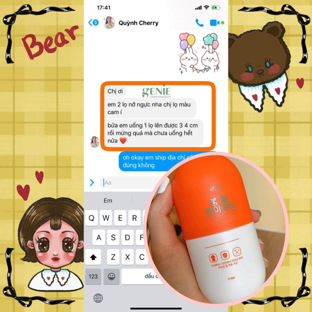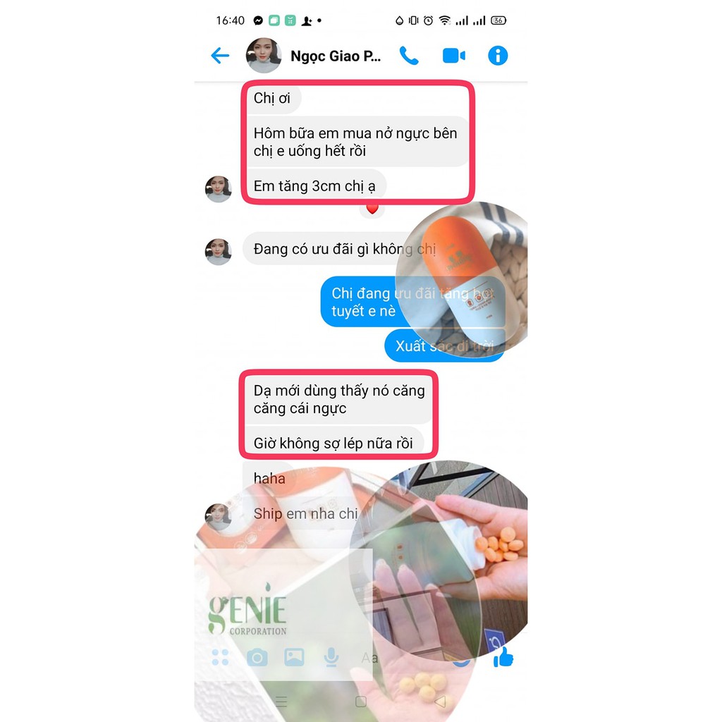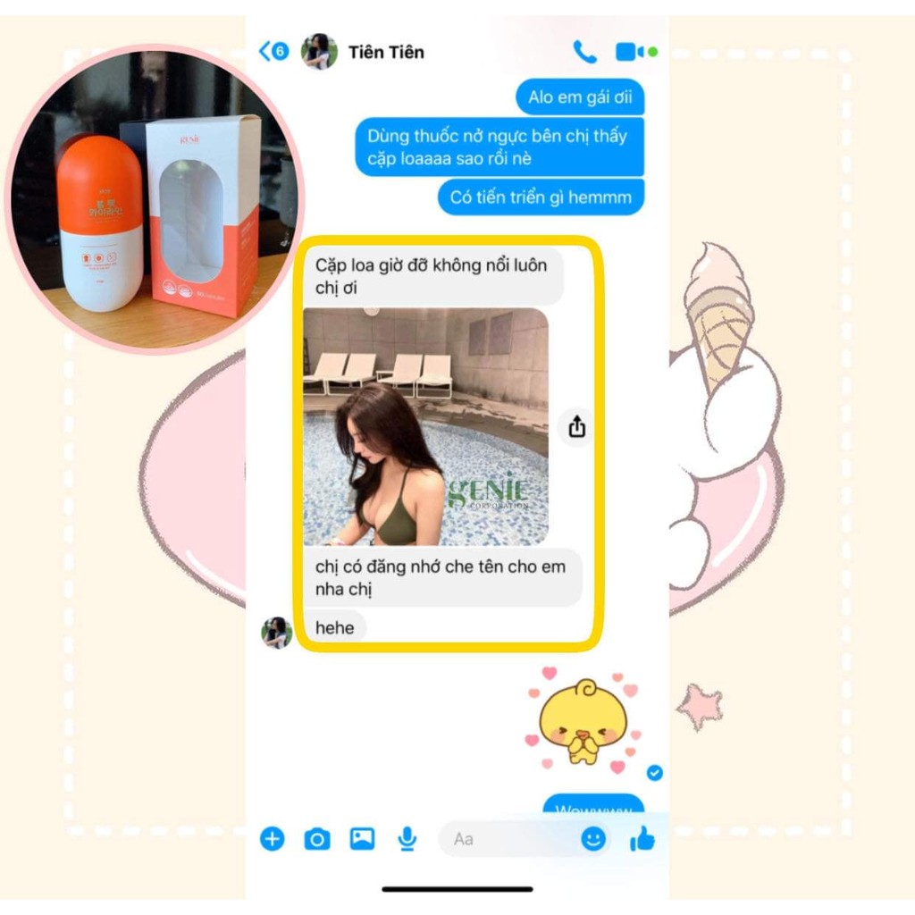 Hãng sản xuất: Genie Xuất xứ: Hàn Quốc Công dụng sản phẩm: Công dụng chính của sản phẩm giúp chị em phụ nữ có bộ ngực như ý. Bạn sẽ sở hữu vòng một săn chắc, nảy nở và quyến rũ nhất. Bên cạnh đó, sản phẩm cò giúp thay đổi hoocmon nữ phát triển và cải thiện nhan sắc xinh đẹp hơn nhiều lần. Chứa các thành phần dinh dưỡng như vitamin A, E và các chất khác giúp ngăn cản các căn bệnh về xương, nhiệt cơ thể, bệnh lý kinh nguyệt khiến chị em lo lắng. Cách sử dụng: Uống 1 ngày 2 viên Sáng 1 viên -tối 1 viên nhé