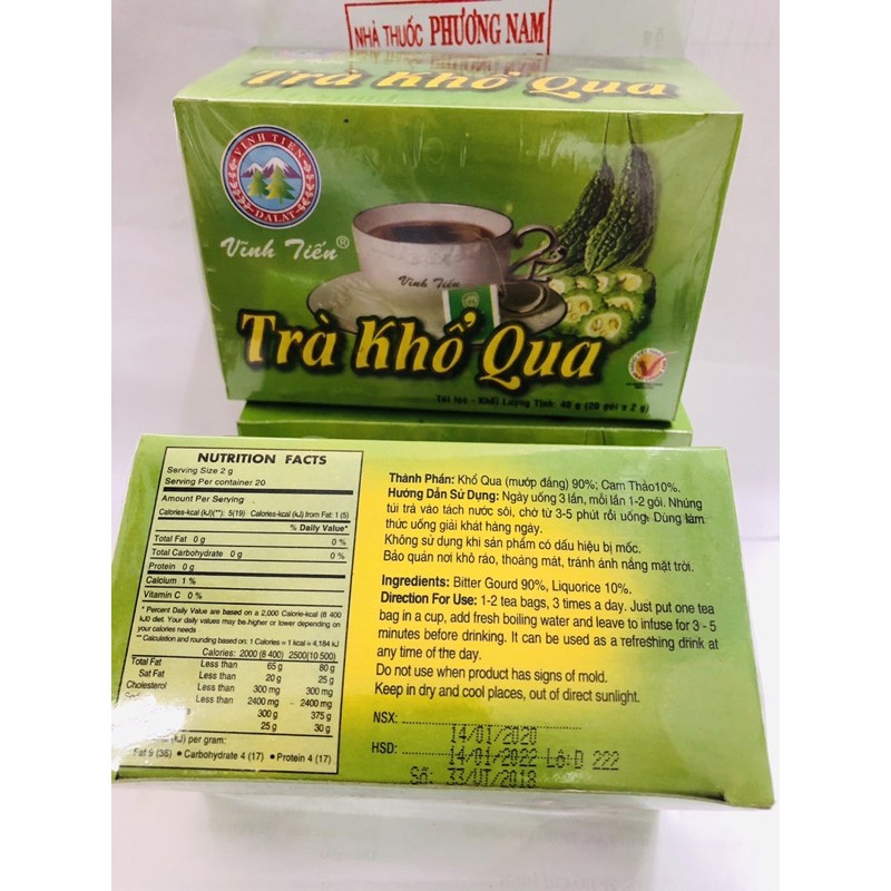 Trà Khổ Qua-Hộp 20 gói.Xem hướng dẫn sử dụng trên hình ảnh sản phẩm shop Phương Nam thiên nhiên việt chụp.Hạn sử dụng :2 năm kể từ ngày sản xuất in trên bao bì(date luôn mới)