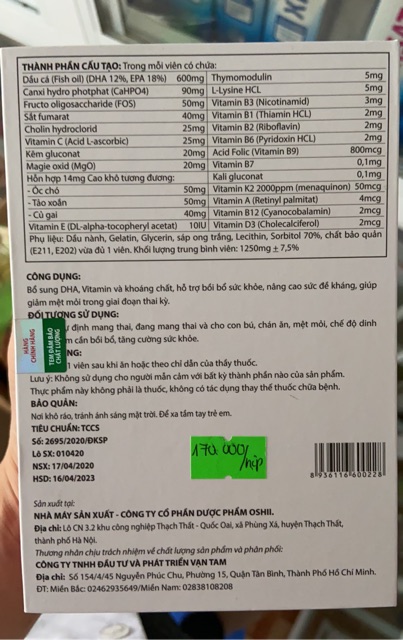 Hộp 30 viên, ngày uống 1 viên sau khi ăn. 🤰🤰 Công dụng 💖 Cung cấp 22 vi chất thiết yếu, quan trọng nhất với mẹ bầu. Công thức được nghiên cứu phù hợp với nhu cầu dưỡng chất của phụ nữ Việt Nam khi mang thai. 💥 SẮT 40mg: Hàm lượng chuẩn, không gây táo bón, nóng trong, nổi mụn. Giúp ngăn ngừa tình trạng thiếu máu ở mẹ (đau đầu, mệt mỏi, ốm nghén) và trẻ, bù đắp lượng máu thiếu hụt trong quá trình sinh con. 💥 ACID FOLIC + CHOLIN+ VITAMIN B12: Những thành phần #quan_trọng_nhất giúp ngăn ngừa nguy cơ khuyết tật ống thần kinh bẩm sinh ở thai nhi. 💥 DHA + EPA: Giúp mẹ bầu phòng ngừa tiền sản giật, đái tháo đường trong quá trình mang thai. Bổ sung DHA giúp phát triển não bộ và thị giác của trẻ ngay từ trong bụng mẹ. 💥 KẼM: Là yếu tố vi lượng quan trọng, giúp giảm nguy cơ khuyết tật bẩm sinh, đồng thời tăng cường sức đề kháng cho cả mẹ và bé. 💥 VITAMIN A, C, E VÀ CÁC VITAMIN NHÓM B: Giúp tăng cường sức đề kháng của cơ thể mẹ, hỗ trợ quá trình trao đổi chất. 👶 Con sinh ra KHỎE MẠNH, CỨNG CÁP, THÔNG MINH VƯỢT TRỘI Sản phẩm này không phải là thuốc và không có tác dụng thay thế thuốc chữa bệnh.