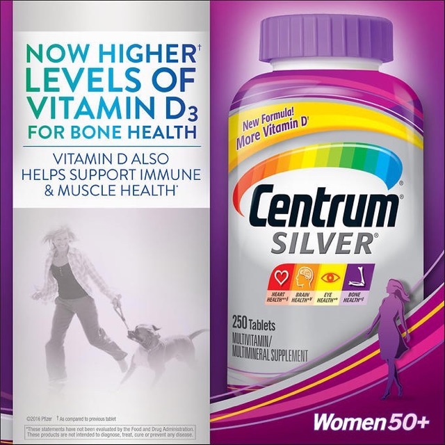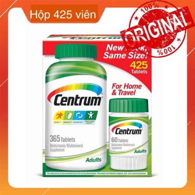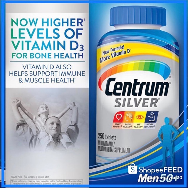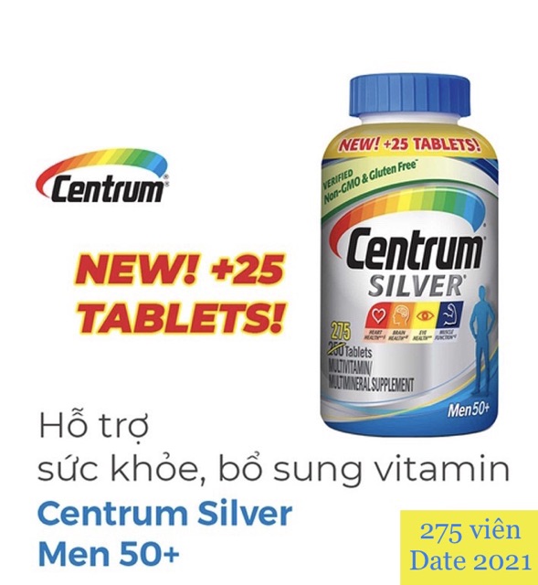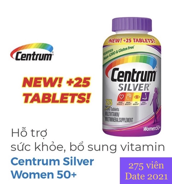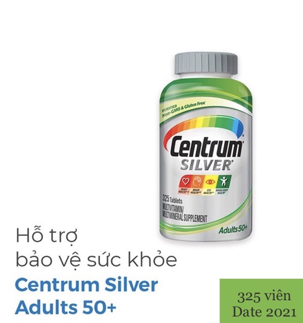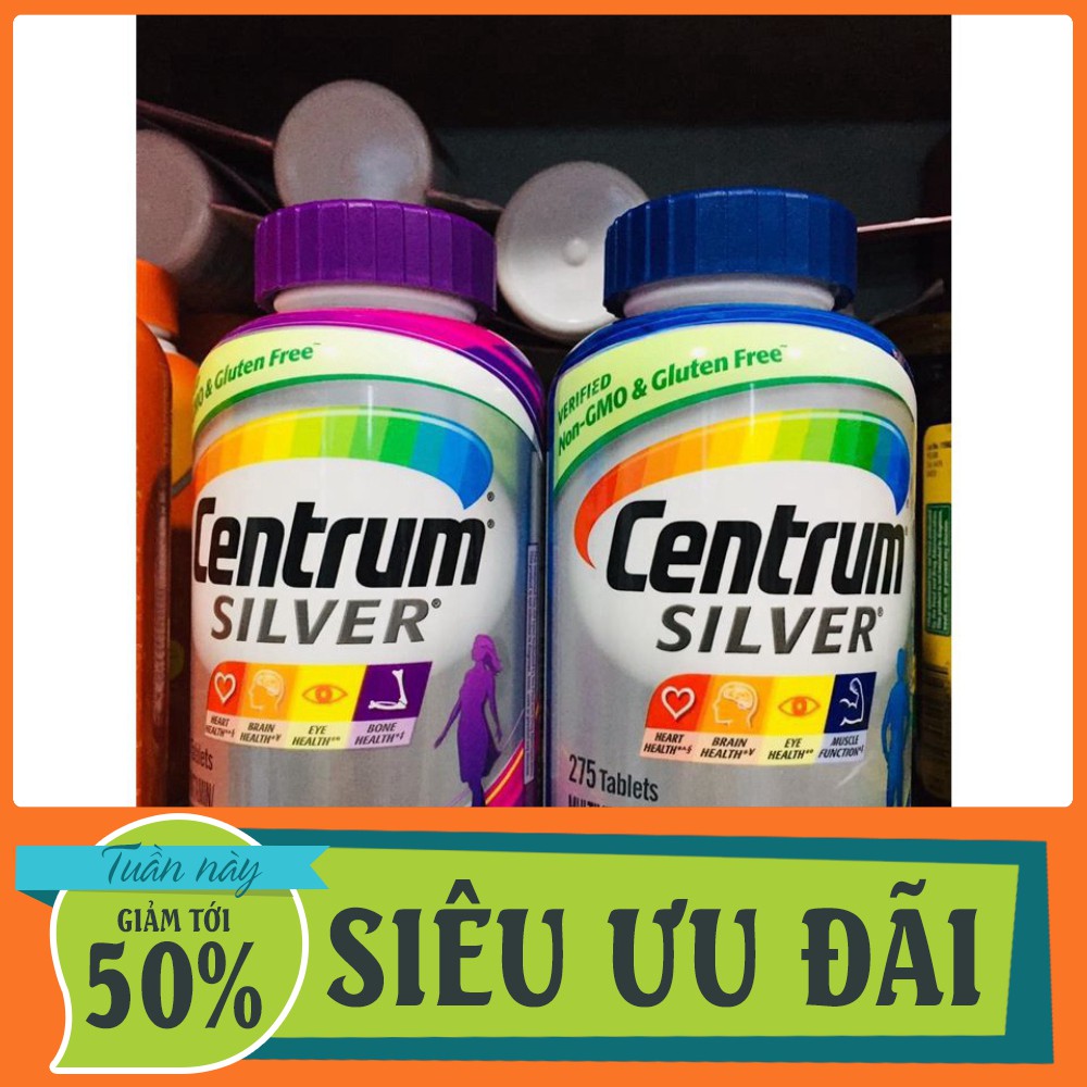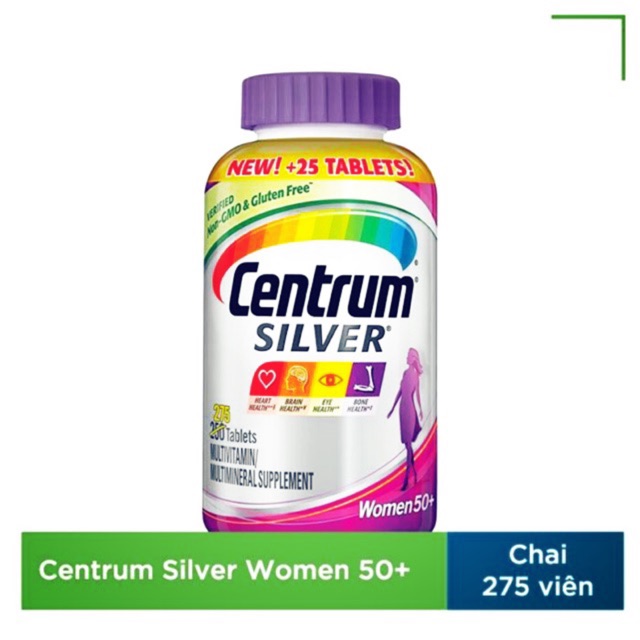 Tên sản phẩm: 1. Centrum Silver Men 50+ chai 275 viên (xanh) 2. Centrum Silver Women 50+ chai 275 viên (tím) 3. Centrum Silver Men & Women 50+ chai 325 viên (xám) 4. Centrum Silver Men & Women hộp 425 viên Xuất xứ: USA Thành phần Centrum Silver - Vitamin D, Antiocidants lycopene, Selenium, Vitamin E, Zinc - Chứa antioxidants lycopene , vitamin C, Zinc - Các vitamin B như B6, B12… - Vitamin C, Folic axit và B6, B12 - Canxi, Magnesium, Potassium - Các vitamin A, C, E và Lutein Đối tượng sử dụng Centrum Silver - Nam nữ giới sức khỏe kém, cơ thể thường xuyên bị suy nhược - Nam nữ giới bị bệnh tim mạch, loãng xương, mắt mờ, trí nhớ kém Hướng dẫn sử dụng Centrum - Mỗi ngày uống 1 viên sau bữa ăn khoảng 30 phút *Lưu ý: Sản phẩm này không phải là thuốc và không có tác dụng thay thế thuốc chữa bệnh.