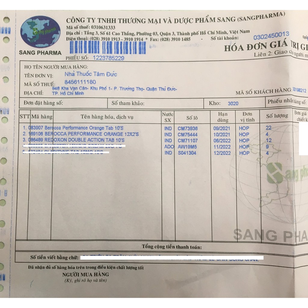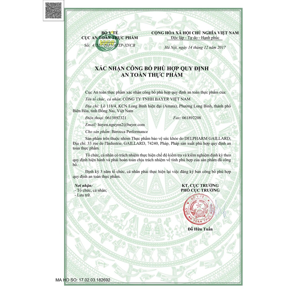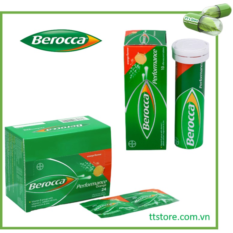 THÀNH PHẦN: Mỗi viên Berocca Performance chứa: Vitamin B1 (Thiamin) ..........................15mg Vitamin B2 (Riboflavin) .......................15mg Vitamin B6 (Pyridoxin) ........................10mg Vitamin B12 (Cyanocobalamin) .......0,01mg Vitamin B3 (Nicotinamid) ....................50mg Vitamin B5 (Acid pantothenic) ............23mg Vitamin B8 (Biotin) ..........................0,15mg Vitamin B9 (Acid folic) ......................0,4mg Vitamin C (Acid ascorbic) ................500mg Calci .................................................100mg Magnesi ...........................................100mg Kẽm ...................................................10mg CÔNG DỤNG - Bổ sung vitamin C và các vitamin nhóm B trong các trường hợp thiếu hụt hoặc tăng nhu cầu. - Bổ sung kẽm trong các trường hợp thiếu hụt hoặc tăng nhu cầu. CÁCH DÙNG - Người lớn và vị thành niên dùng 1 viên/ngày. - Dùng đường uống, hòa tan 1 viên trong 200ml nước. ĐỐI TƯỢNG SỬ DỤNG - Người lớn và vị thành niên trên 12 tuổi. Hương vị: Cam Quy cách đóng gói: - Hộp 1 tuýp 10 viên - Hộp 24 viên (chứa trong các vỉ nhôm riêng biệt, dễ bảo quản) Sản phẩm này không phải là thuốc, không có tác dụng thay thế thuốc chữa bệnh. Bảo quản: Nơi khô ráo, thoáng mát, tránh ánh sáng trực tiếp. Sản xuất tại: PT Bayer Indonesia Xuất xứ: Indonesia
