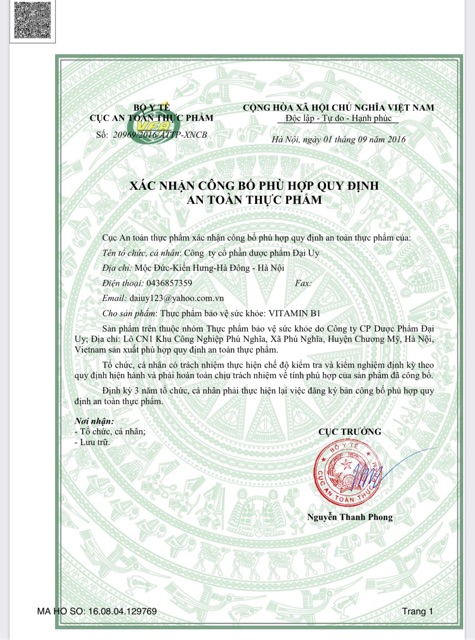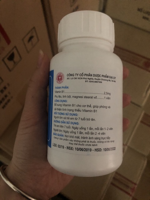 Công dụng : bổ sung vitamin b1 cho cơ thể, giúp phòng và cải thiện tình trạng thiếu vitamin b1. Người lớn uống mỗi lần 2-4 viên. Trẻ em uống mỗi lần 1 viên. CHỐNG CHỈ ĐỊNH Chưa thấy báo cáo. Hạn sử dụng 3 năm kể từ ngày sản xuất. In trên bao bì. Cty cổ phần dược phẩm Đại Uy