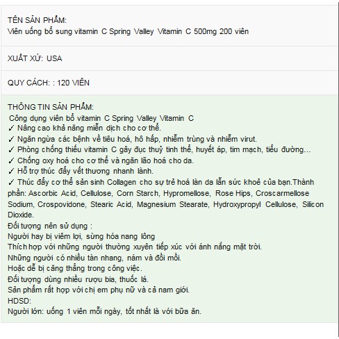 Sản phẩm Viên Vitamin C 500 Mg Spring Valley hiện tại đang được bán online với giá tốt nhất trên thị trường là 299.900đ