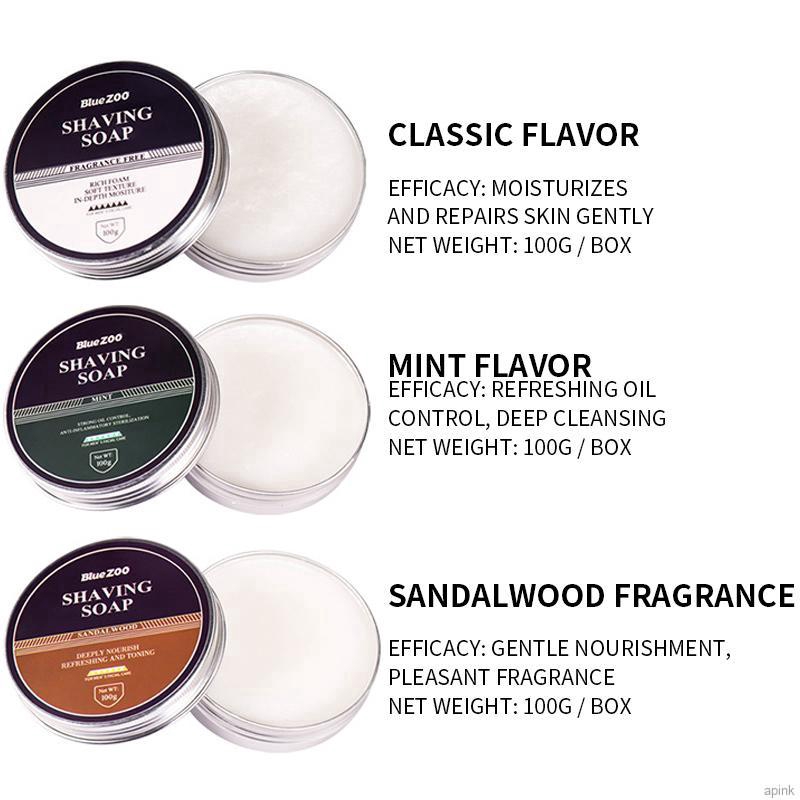 Description: 1:A great and effectiveproduct formen’s facial care and wetshaving. 2:The soap creates a rich, thick lather,the lather will last for a long time will not dry on the face. 3:Rich in these nutrients:Olive oil、Shea butter、Glycerin,etc,it is good at moisturizing and softening the skin when shaving ,providing you a comfortable feelingwithout nicks and cuts , make shaving easier. 4:Specially addedLicorice extract、Allantoin;the active essencerapidly penetrate the skin,and smooth it。 5,easy to store and convenient to use. Specification: [Brand name]: shaving soap [Product Category]: Men's facial care [Weight with packaging]: 100g (soap body), 142g (including aluminum can, without outer box), 161g (including box) [Efficacy characteristics]: tasteless, sandalwood, mint