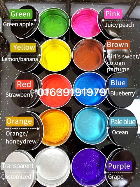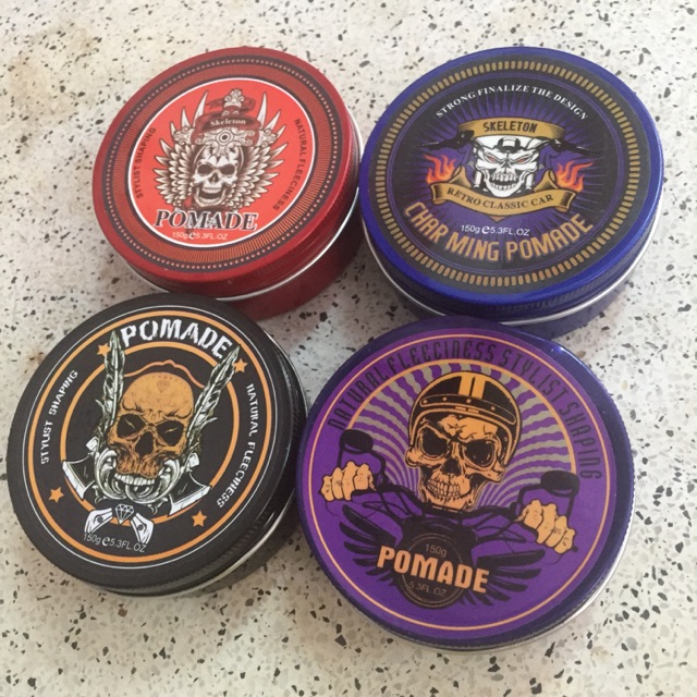 Pomade: Đây là sản phẩm cung cấp độ bóng thấp tới cao, phù hợp cho các kiểu tóc cổ điển như Classic Pompadour. Nó sẽ rất tuyệt vời nếu bạn dùng lược để chải, Nếu Wax (sáp vuốt tóc) mang một phong cách trẻ trung năng động, lên tóc nhìn tự nhiên thì Pomade trái ngược với Wax, Pomade lên tóc và xài lược để chải trong bạn rất là đàn ông, một người trưởng thành, thanh lịch Màu đen: hương x-men Màu đỏ: hương dâu Màu tím: hương nho Màu xanh dương: quả mọng xanh Màu xanh lá: hương táo Giá: 55k