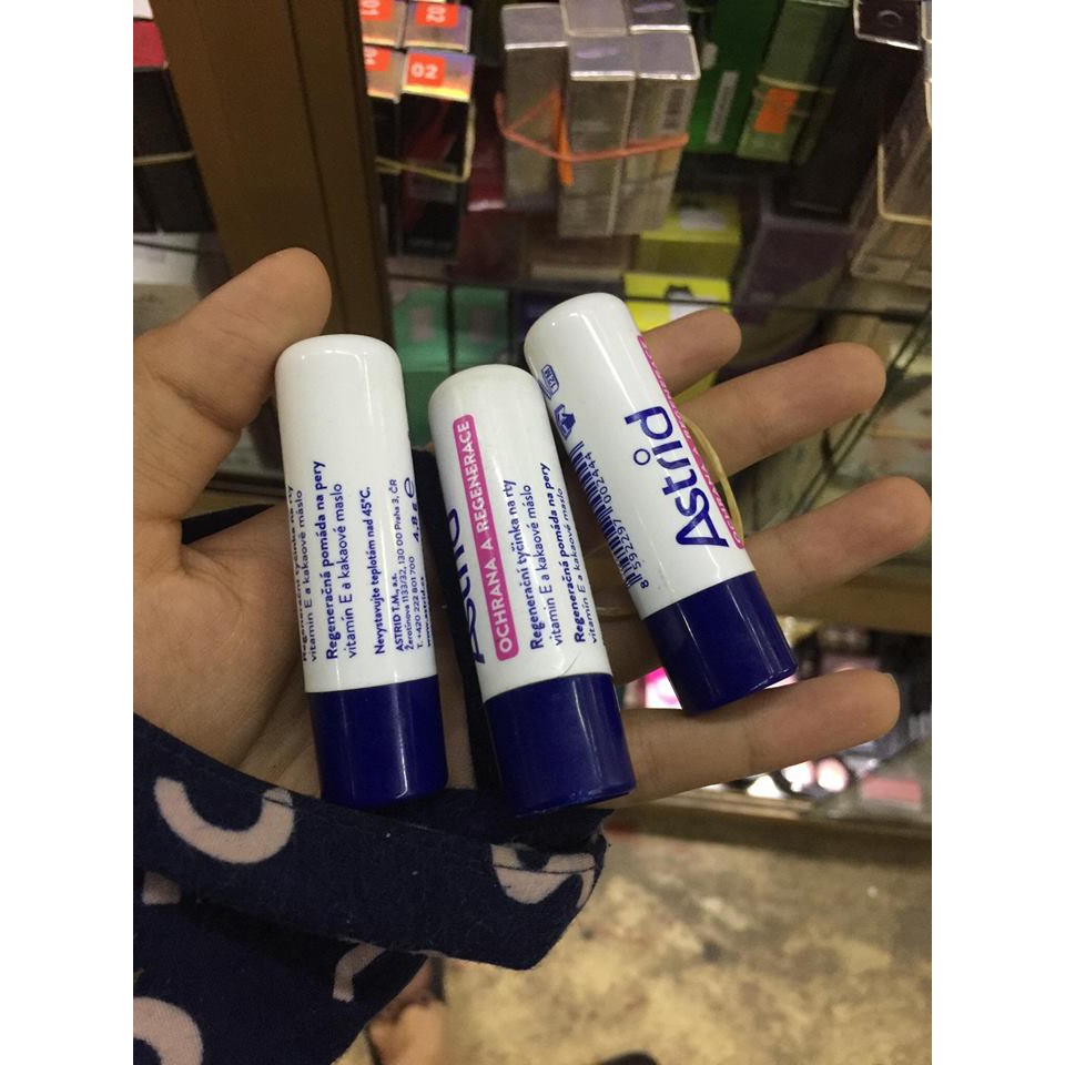 Son Dưỡng Mỡ Hươu Astrid mẫu mới Xuất xứ: Séc Son dưỡng nhẹ nhàng cấp nước cùng các dưỡng chất cần thiết cho làn môi của bạn đồng thời làm giảm tình trạng môi khô, nứt nẻ chỉ sau 2 ngày sử dụng mang đến cho bạn làn môi luôn căng mọng, tràn đầy sức sống. Son Dưỡng Mỡ Hươu Astrid còn có tác dụng tẩy lớp tế bào chết trên môi giúp các dưỡng chất thấm sâu hơn đồng thời khiến môi luôn căng mịn, tươi tắn, thu hút mọi ánh nhìn. – Bạn apply 1 lượng vừa đủ sản phẩm lên môi, massage nhẹ nhàng để sản phẩm thấm sâu hơn sau đó đánh các loại son khác nhé hoặc sử dụng trước khi đi ngủ nhé