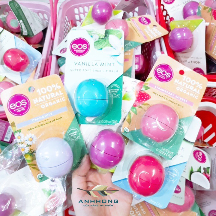 EOS là một thương hiệu Evolution Of Smooth đến từ Mỹ với đa dạng các mặt hàng dưỡng ẩm như dưỡng ẩm môi, dưỡng ẩm tay, dưỡng ẩm toàn than - Son dưỡng môi EOS Smooth Sphere Lip Balm có thiết kế đặc biệt, đáng yêu với hình dạng tròn, hơi dẹt, cầm gọn trong lòng bàn tay được hãng mô tả như một quả trứng. - Son dưỡng môi EOS có nhiều mùi khác nhau và có thiết kế bao bì gồm màu chủ đạo tương thích với mùi đặc trưng của son: + Vanilla Bean ( màu trứng gà ) ; mùi hương vani + Vanilla Mint ( màu đỏ xọc trắng ) : mùi bạc hà pha vani. + Strawberry Sorbet:( màu hồng nhạt,) mùi hương dâu. + Honey Apple (màu hồng nhạt ) mùi táo, mật ong. + Cooling Chamomile ( xanh biển xọc trắng ) mùi hương kẹo bạc hà. + Summer Fruit ( màu xanh lá xọc trắng ) hương trái cây gồm đào, dây, việt quất. - Thành phần: sáp ong, hạt dầu hoa hướng dương, sáp Carnauba, dầu hạt Jojoba, Shea Butter, dầu olive chứa vitamin E. - Công dụng: + Dưỡng ẩm cho môi tức thời, làm môi mềm mại . + Dưỡng ẩm cho môi và làm lớp nền môi trước khi trang điểm. + Ngăn ngừa nứt nẻ môi và khô môi, bong tróc môi . - Cách sử dụng : + Sử dụng để dưỡng môi bất cứ khi nào, cho đôi môi mềm mại hồng hào. + Sử dụng trước lớp trang điểm môi để bảo vệ môi trước tác hại của mỹ phẩm và môi trường. . Thoa từ trung tâm đến các cạnh bên ngoài của môi của bạn. Sau đó, lướt qua toàn bộ môi dưới. 😅 Bảo quản nơi khô ráo, thoáng mát, tránh ánh nắng trực tiếp.
