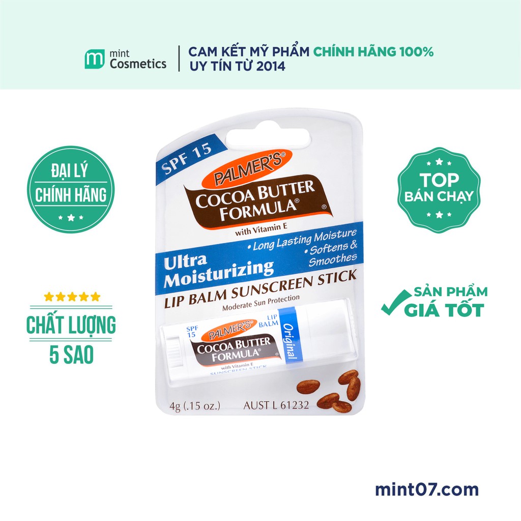 Son Dưỡng Môi Chống Khô Nứt Nẻ SPF15 PALMER'S - Hương Cherry (4g) dưỡng và bảo vệ đôi môi hiệu quả với khả năng chống nắng cao SPF15 ngăn cản tia cực tím ảnh hưởng tới làn da môi. Sản phẩm được bổ sung tinh chất bơ ca cao và vitamin E giúp cung cấp độ ẩm, làm dịu đôi môi khô nứt, giảm thiểu tình trạng thâm môi không đều màu,... Ngoài ra mùi hương cherry mời gọi đầy thu hút sẽ giúp bạn thêm thích thú khi dùng sản phẩm Son Dưỡng Môi Chống Khô Nứt Nẻ SPF15 PALMER'S - Hương Cherry (4g). Thông tin sản phẩm Hương cherry tươi mát Son có mùi hương trái cây cherry tươi mát thức tỉnh đôi môi. Mùi hương ngọt dịu thoang thoảng dễ chịu cho người dùng. Dưỡng ẩm hiệu quả Sản phẩm chống lão hóa da, tăng cường độ ẩm cho da môi, nuôi dưỡng cải tạo làn da khô, tái tạo tế bào da chết. Sản phẩm trả lại cho bạn bờ môi căng mịn, tràn đầy sức sống. Khả năng chống nắng SPF15 Sản phẩm với khả năng chống nắng tốt, bảo vệ đôi môi dưới ánh nắng mặt trời. Giảm thiểu tình trạng môi khô, cong thâm do tác động từ ánh nắng. Thành phần thiên nhiên an toàn Thành phần từ bơ ca cao được biết đến với khả năng dưỡng ẩm cao. Lành tính với cả đôi môi nhạy cảm nhất. Hướng dẫn sử dụng - Sử dụng bất cứ lúc nào cảm thấy cần dưỡng ẩm cho đôi môi. - 'Trọng lượng: 4g. Mint Cosmetics ❤ ☎️Hotline: 💌 098.257.6363 💌 0946.107.668 💌 0946.197.668 💌 🏡 CS1: Số 7 ngõ 100 Tây Sơn, Đống Đa. 🏡 CS2: Số 104 ngõ 72 Nguyễn Chí Thanh (ngõ cạnh Heytea) 🏡 CS3: Số 36 Hạ Hồi, Hoàn Kiếm. 🏡 CS4 : Số 43 Bùi Thị Xuân, Hai Bà Trưng. 🏡 CS5 : Ngõ 215 Tô Hiệu, Cầu Giấy. ( Đầu ngõ cạnh Mộc Quán) 🏡 CS6 : Số 61 Vạn Bảo, Ba Đình.