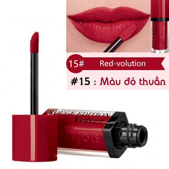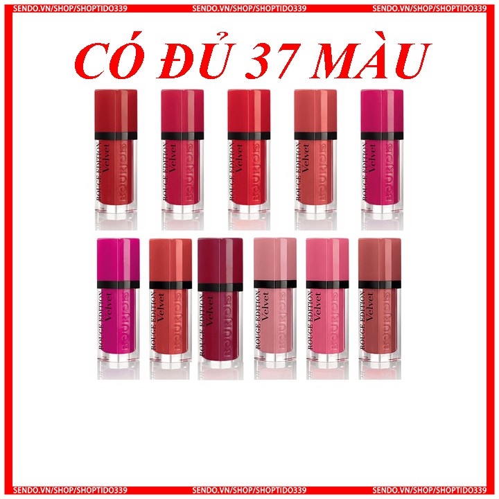 Thương hiệu: Bourjois ROUGE EDITION VELVET LIQUID LIPSTICKS Dung tích : 7.7 ml Xuất xứ: Pháp – Bổ sung dưỡng, giúp môi mềm mượt, giảm khô và bong tróc môi. – Lên màu chuẩn và lâu trôi. – Sắc son trẻ trung, dịu dàng và ngọt ngào. – Kết cấu son siêu mướt, không vón cục. – Bảo vệ môi trước các tác động bên ngoài, dưỡng môi luôn căng mọng tươi trẻ. Dòng son Velvet ra đời là một bước tiến lớn trong ngành công nghiệp làm đẹp của Bourjois. Nhờ có 1. Đỏ tươi, đỏ rực rỡ, đỏ nổi bật 2. Màu đỏ tông hồng, đỏ hồng mâm xôi, rất xinh, rất yêu, hợp với mọi tông da, mọi hoàn cảnh, dịu dàng 3. Hot Pepper – đỏ cam tuyệt đẹp, rực rỡ với sắc cam và quyến rũ với sắc đỏ . 4. Peach Club – cam đào nhẹ nhàng, màu son mơ màng, 5. Olé Flamingo – hồng đậm sâu lắng, sáng nhưng lại không quá chói, 6. Pink Pong 06 hồng đậm tươi sáng và ngọt ngào của hoa Fuchsia 7. Nude-ist, Bourjois velvet 07 là màu hồng nude tự nhiên, hồng có undertone nâu, tone ấm kiểu “rosy nude”, không tươi rói nổi bật như cam hay neon, cũng không trầm như đỏ vampire hay nâu 8. Grand Gru – 08 đỏ cherry, màu đỏ “chất”, cực kì nổi bật, hút hồn 9. Happy Nude Year – 09 Bourjois 09 thuộc tông hồng nude sáng 10. Don’t Pink Of It - tông hồng pastel nude, tông son tự nhiên, nhẹ nhàng 11. St Don’t So Happink thuộc tông hồng tươi sáng 12. Beau Brun 12 tông son đỏ gạch ,Với sự pha trộn của sắc đỏ táo bạo cùng một chút trầm của nâu gạch khiến Bourjois Velvet Beau Brun 13. Fu(n)chsia – tông hồng ánh đỏ trẻ trung và ngọt ngào vô cùng. 14. Plum Plum Girl – son màu mận chín cực kì cá tính và vô cùng nổi bật. 15. Red Volution - đỏ thuần quyến rũ, sắc đỏ lịm người, đỏ rất sâu nên rất sang. 16. Honey Mood – thỏi son xinh đẹp với tông cam nâu san hô tươi sáng 17. Cool Brown - một màu nâu lạnh “thời thượng”. 18. Thoạt nhìn hơi giống với thỏi bourjois đỏ cam 03, nhưng thiên đỏ nhiều hơn. 19. Jolie-de-vin, nhìn ngoài “em ý” là sự pha trộn của màu 08 và 15 nhưng sắc đỏ của Jolie-de-vin 19 lại “đầm và lạnh” hơn 20: Poppy days Đỏ cam 21: Saperliprunette Tím Trendy 22: Abricoquette Hồng Cam Xinh Xắn 23: Chocolat Corset Nâu Socola Hot Trend 24: Dark Chérie Đỏ Cherry Mê Hoặc 25: Berry Chic Tím Mận Quyến Rũ 26: Let it beige 27: Café Olé Hồng Đất Trầm Ấm 28: Chocopink Cam Đào Ngọt Mọng 29: Nude York Hồng Nâu Sang Chảnh 30: Oranginal Cam Tươi Tỏa “Nắng” 31: Cam Đất Thời Thượng 32: Trop Brunché Hồng Đất Tôn Da 33: Brun’Croyable Đỏ Đất Quyến Rũ [ HOT NHẤT NĂM] 34: Belle Amoureuse Hồng Cánh Sen Đẹp Đẽ 35: Babe Idole Hồng Tím Cá Tính 36: In Mauve Tím Hoa Cà Độc Đáo 37: Ultra Violette Hồng Mận Ấn Tượng
